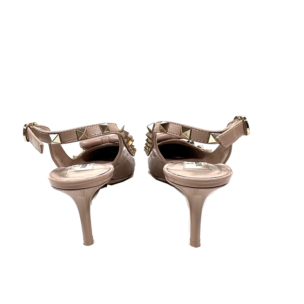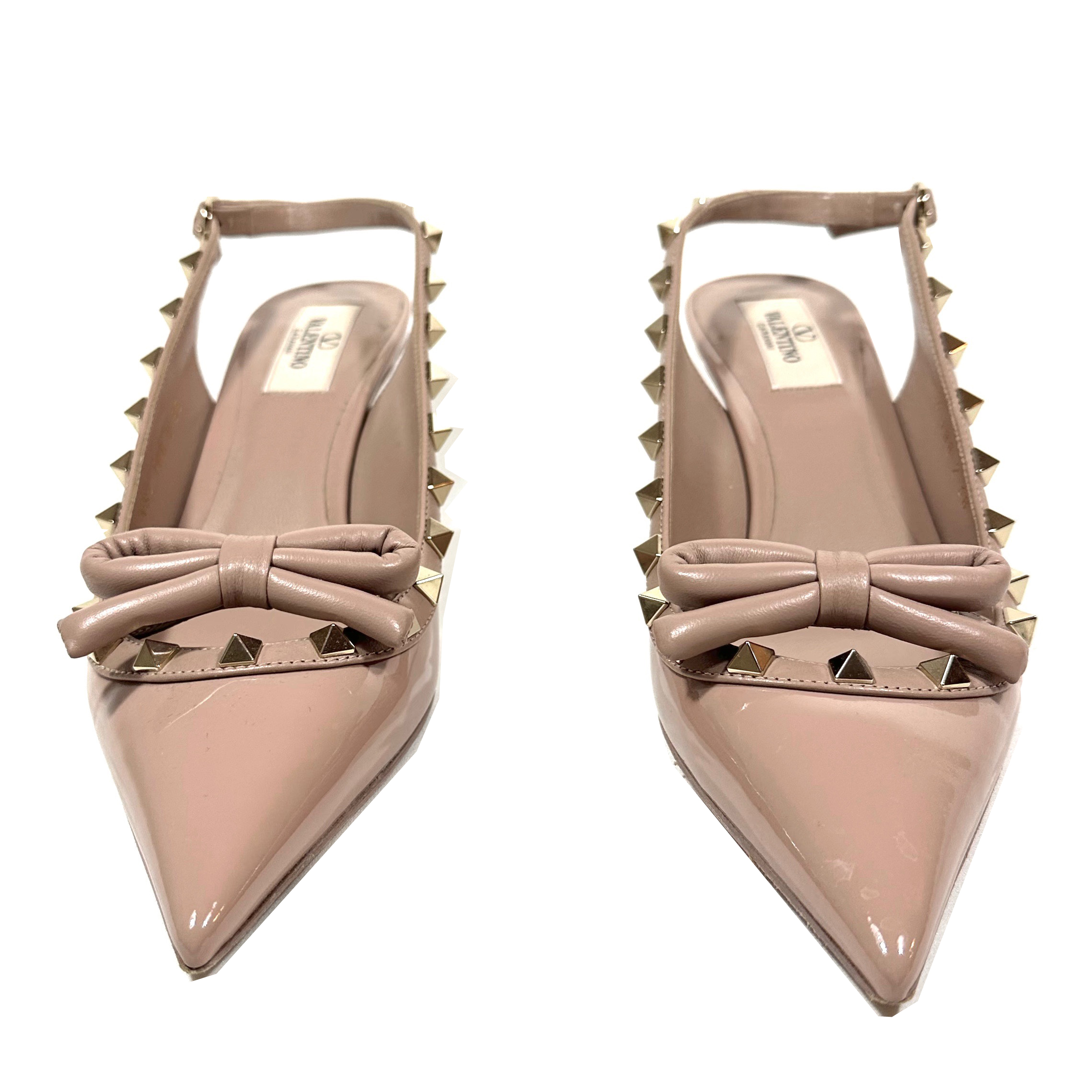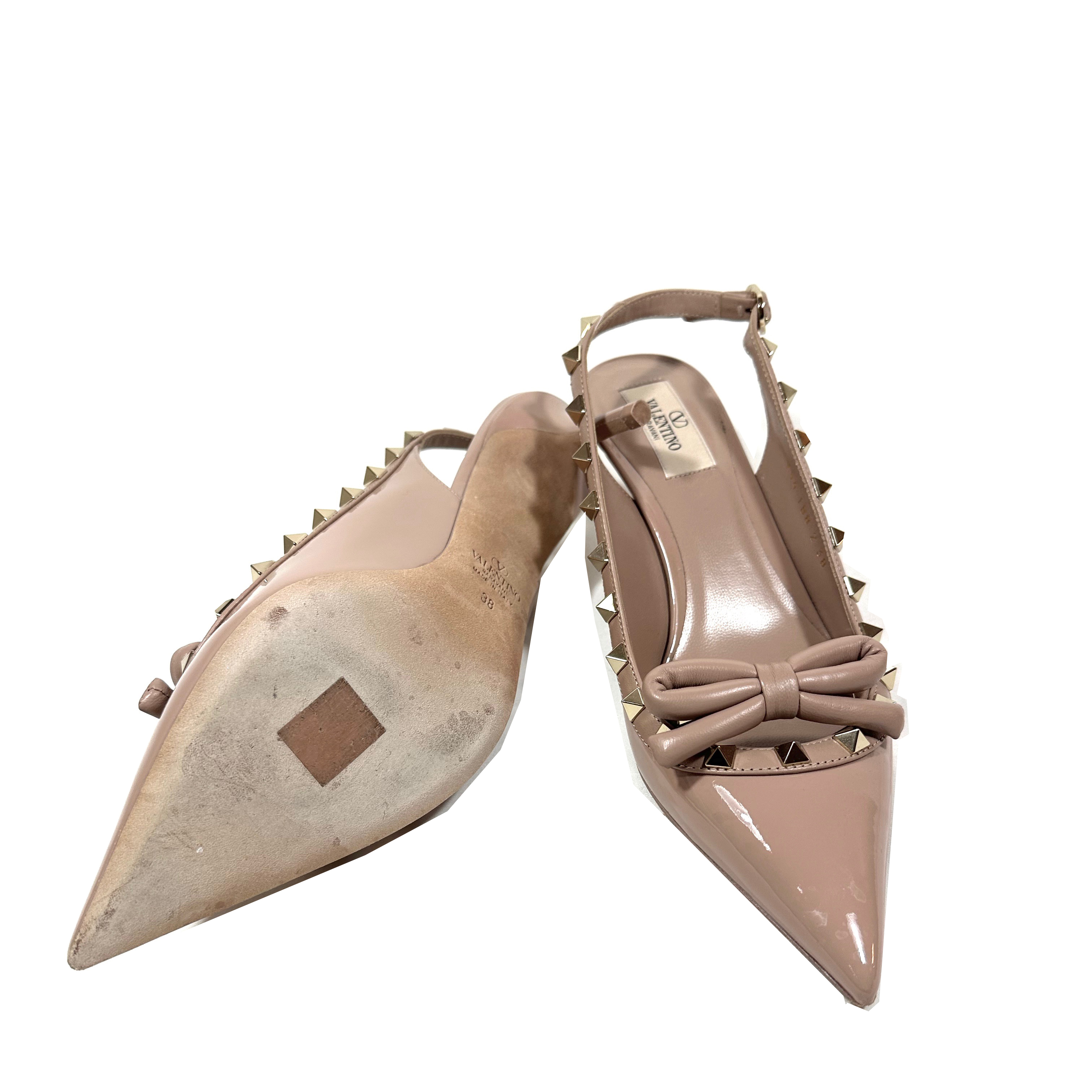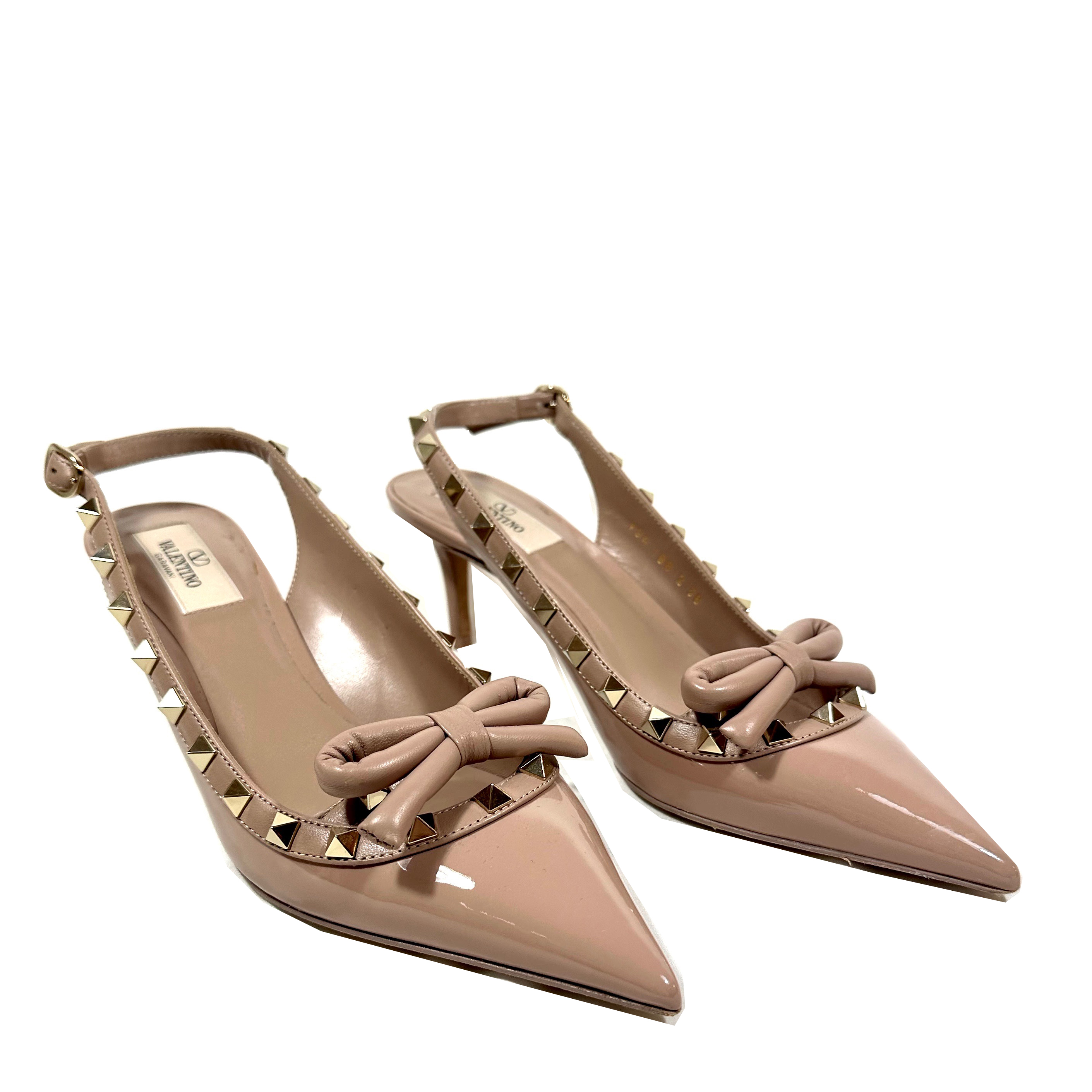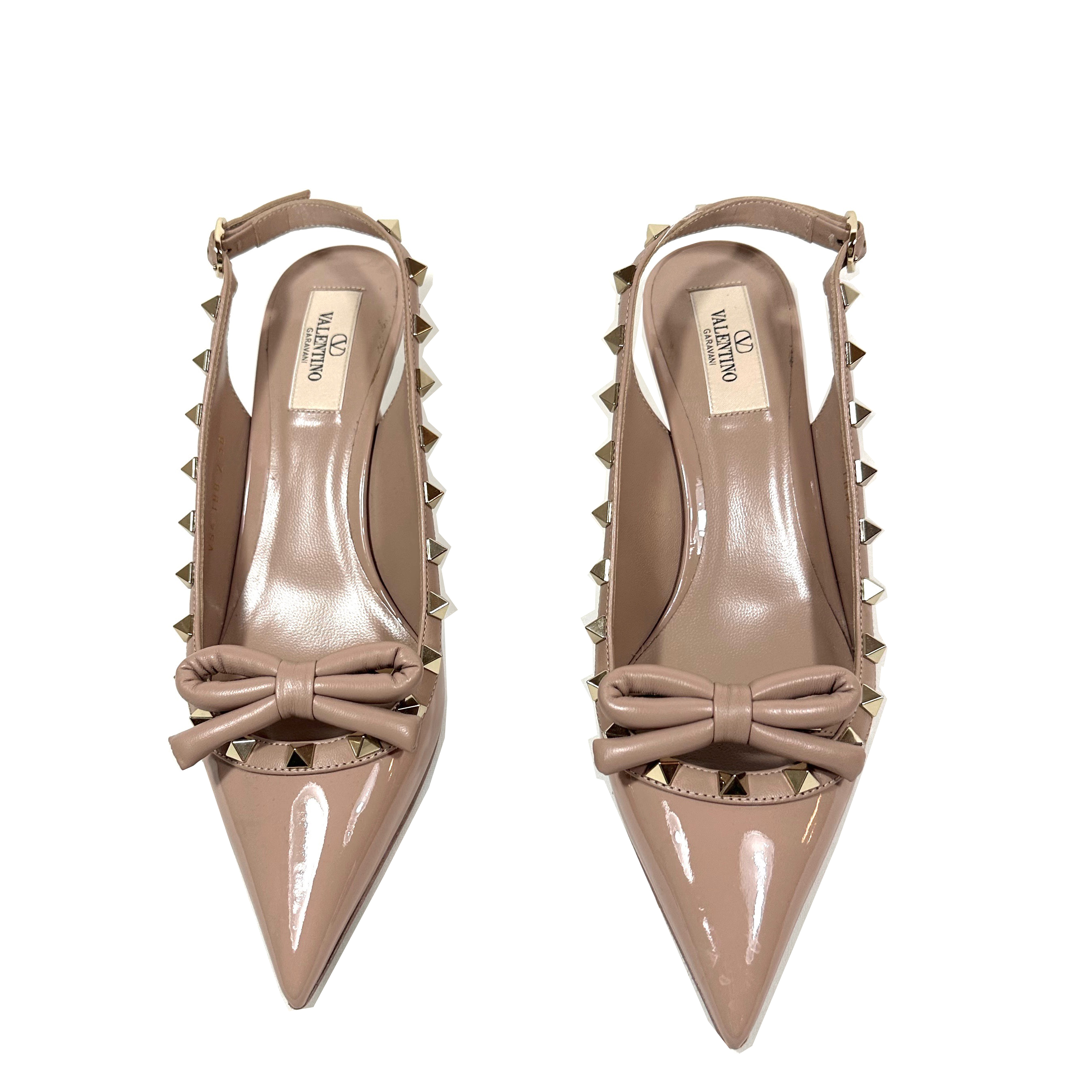 Valentino Garavani Rockstud 60 Slingback Pumps. Beige patent leather, beige leather bow on toe, adorned with rose gold toned studs/hardware, bucket-fastening ankle strap. Size 38, pointed toe, innersole 26 cm, heel 6 cm, leather soles Dustbags included.