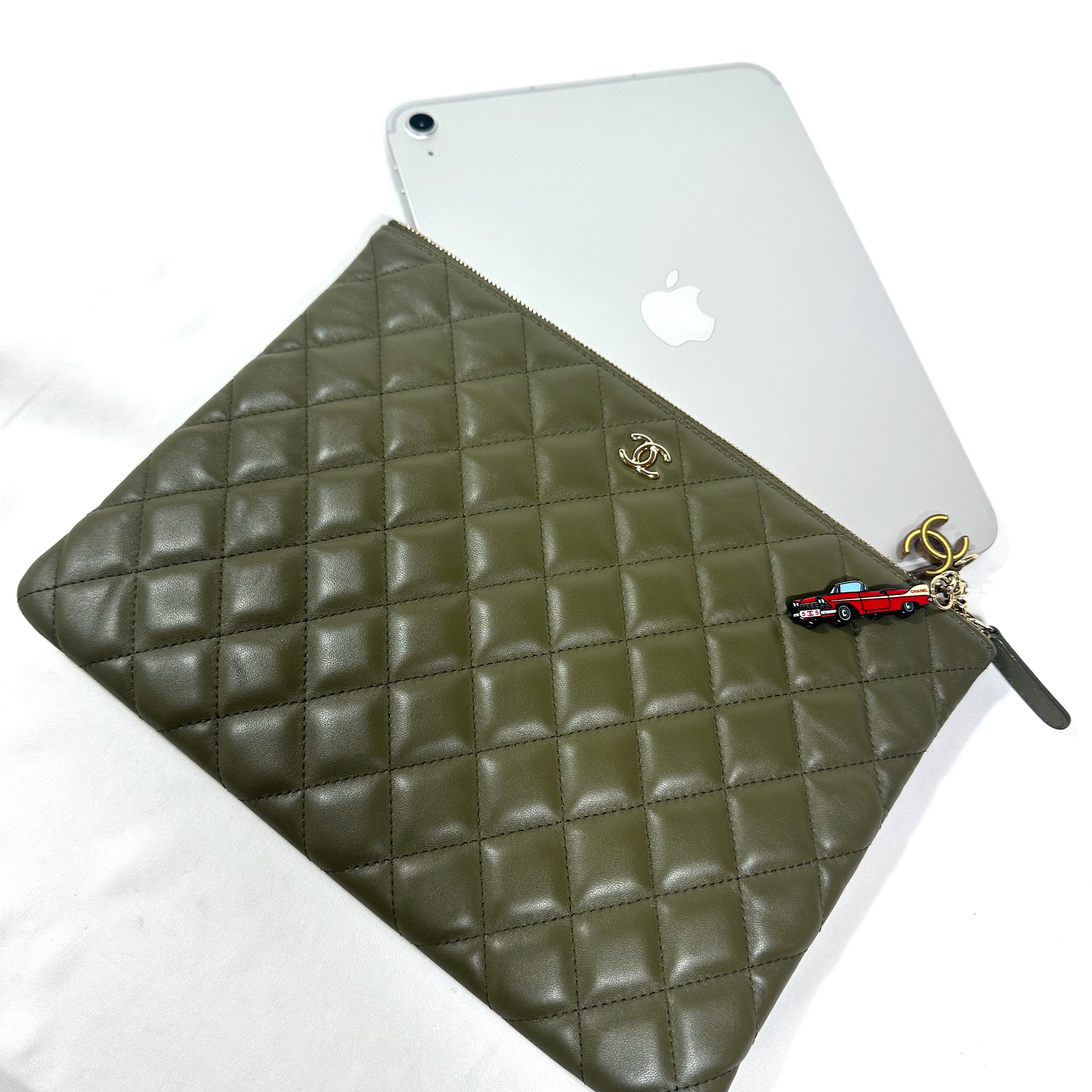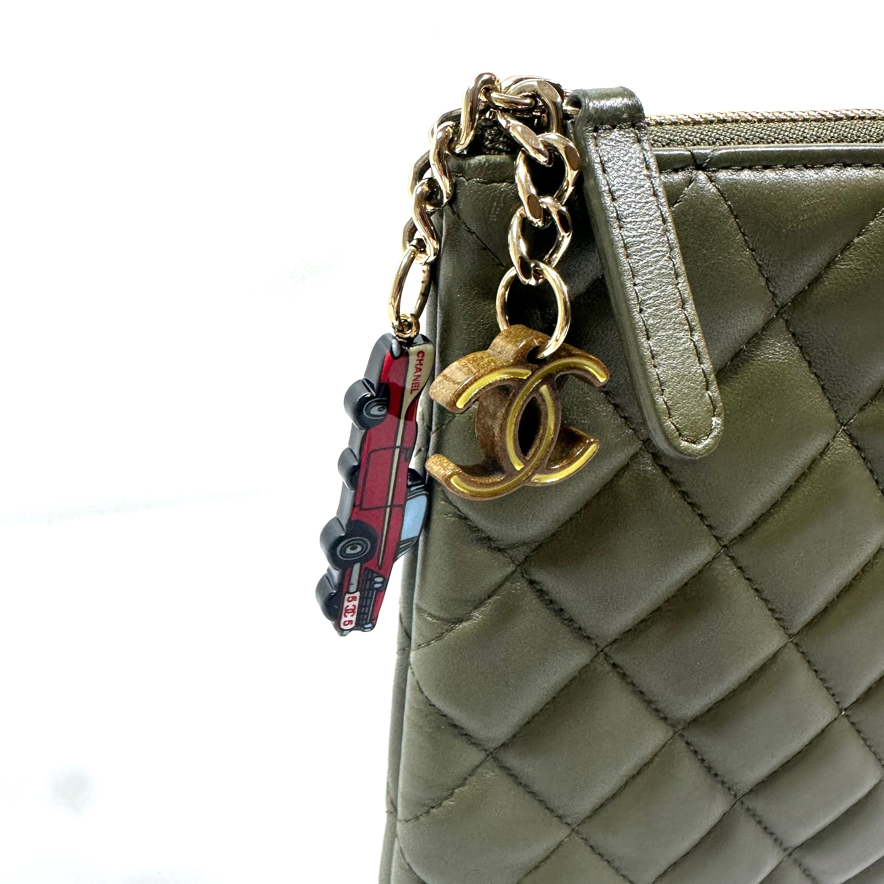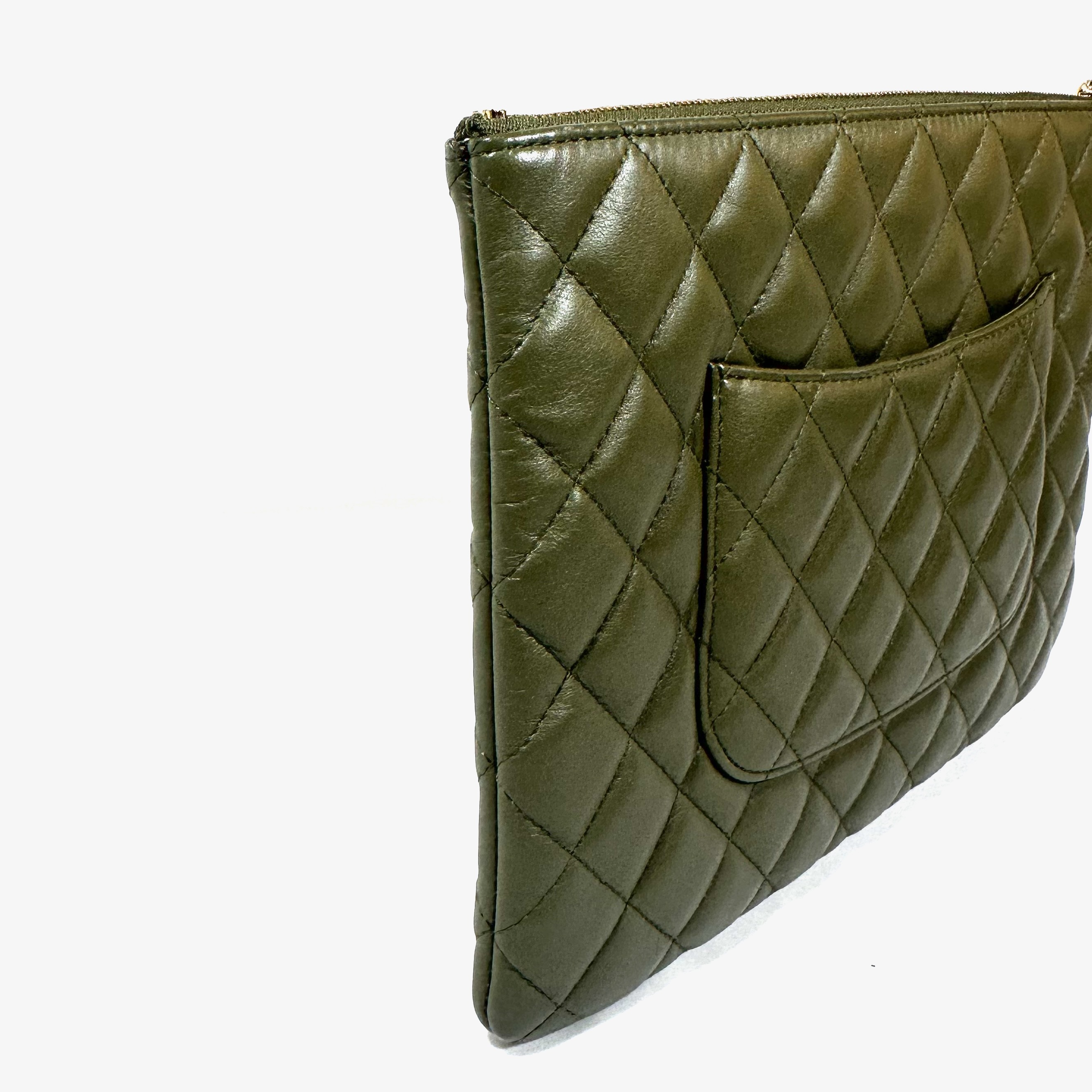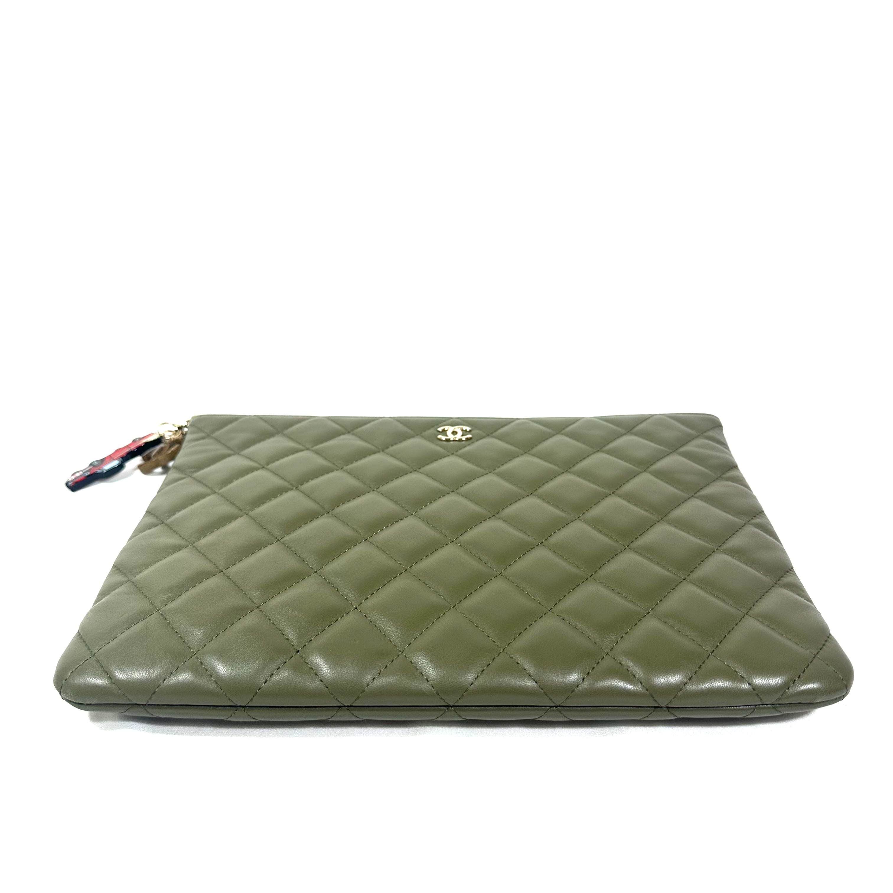 Chanel Medium Quilted Lamb Leather Cuba la Habana O Case Clutch. Khaki green quilted lamb leather, gold toned hardware. Top zip closure with car and CC charm attached to leather pull. CC logo on top front, open pocket at rear. Serial number 23060739, clutch produced 2016-17.