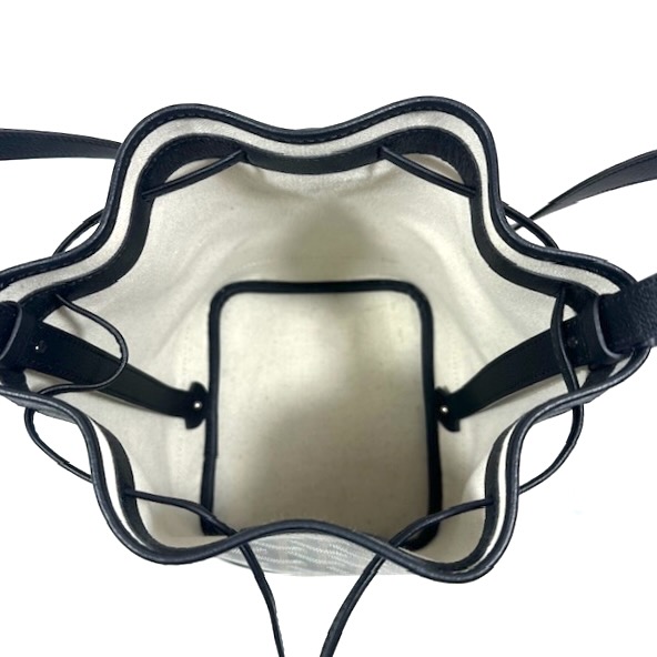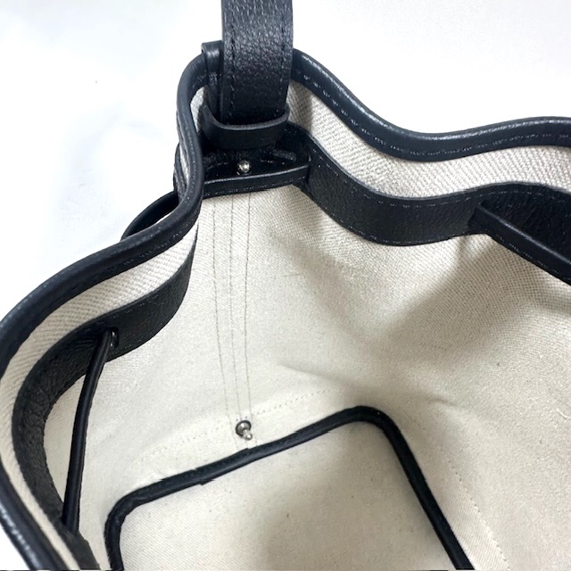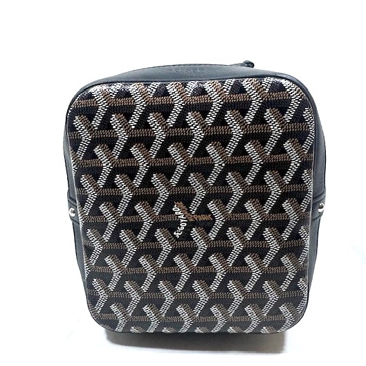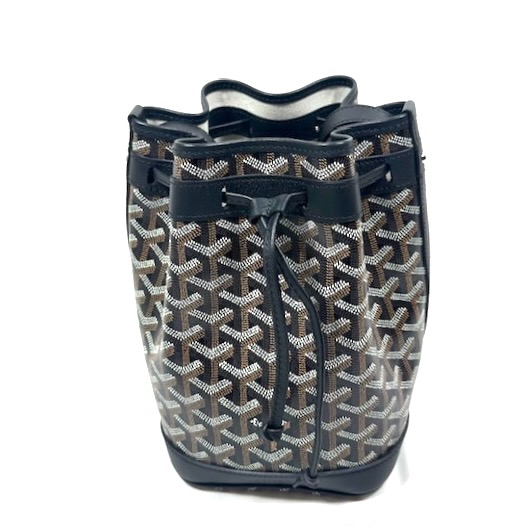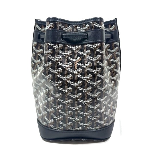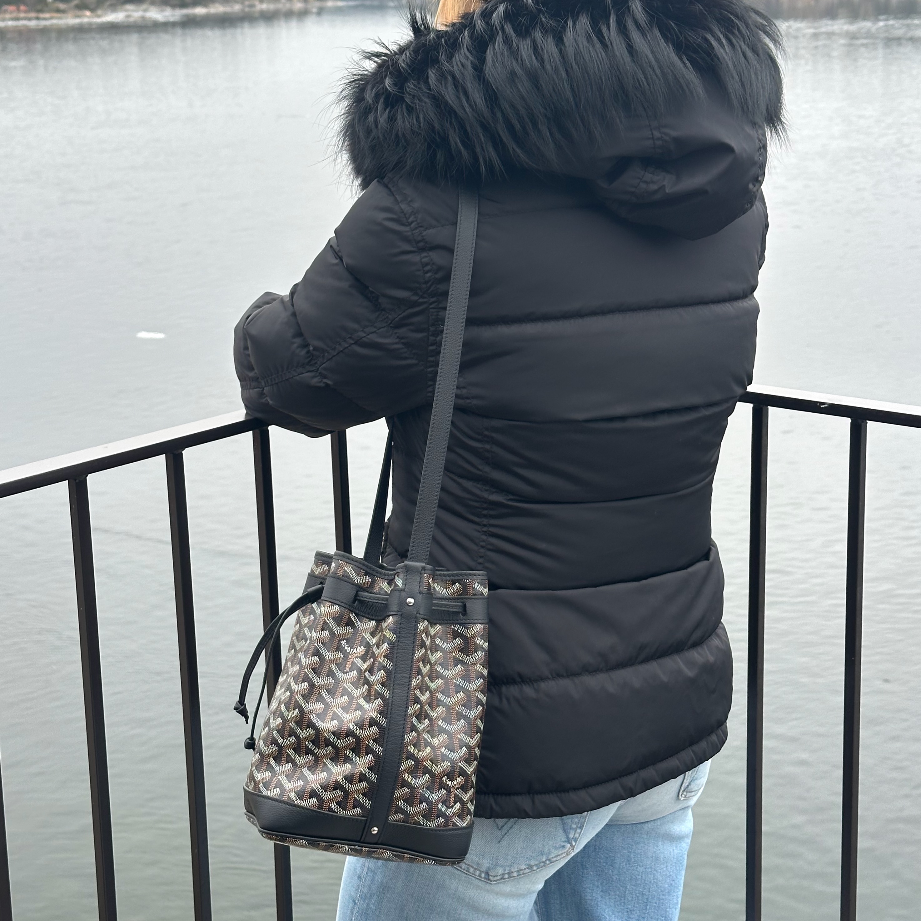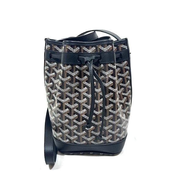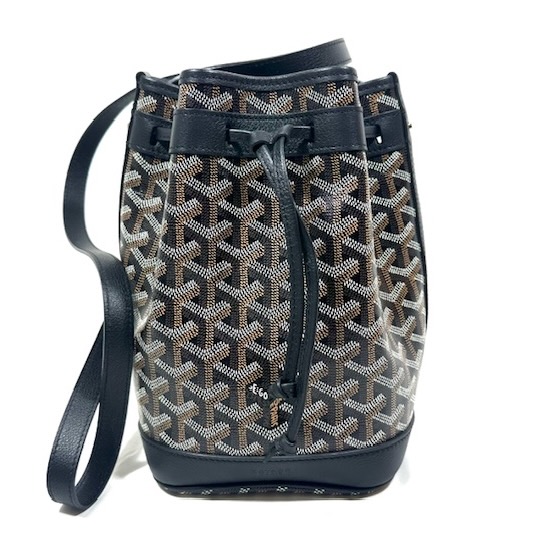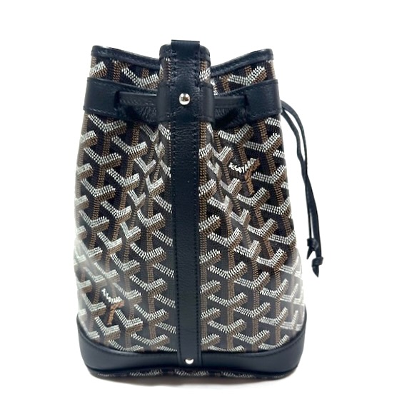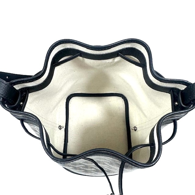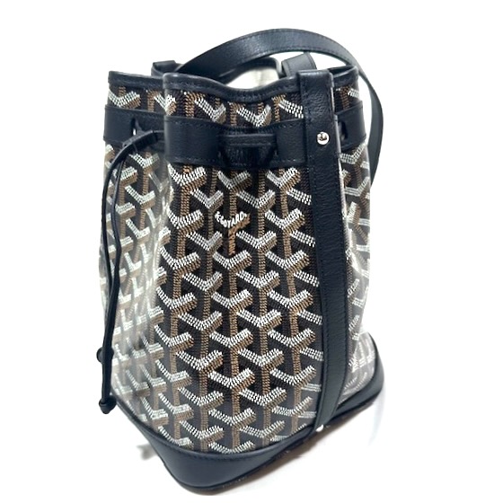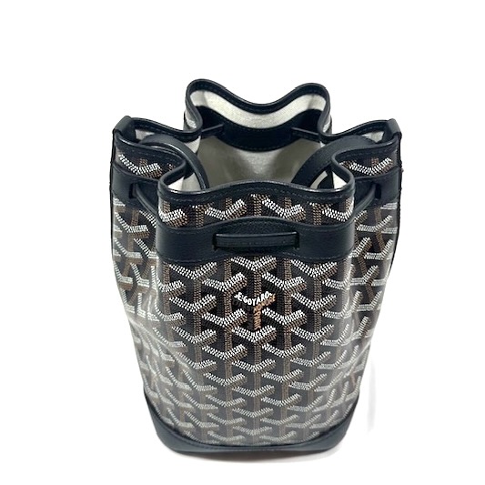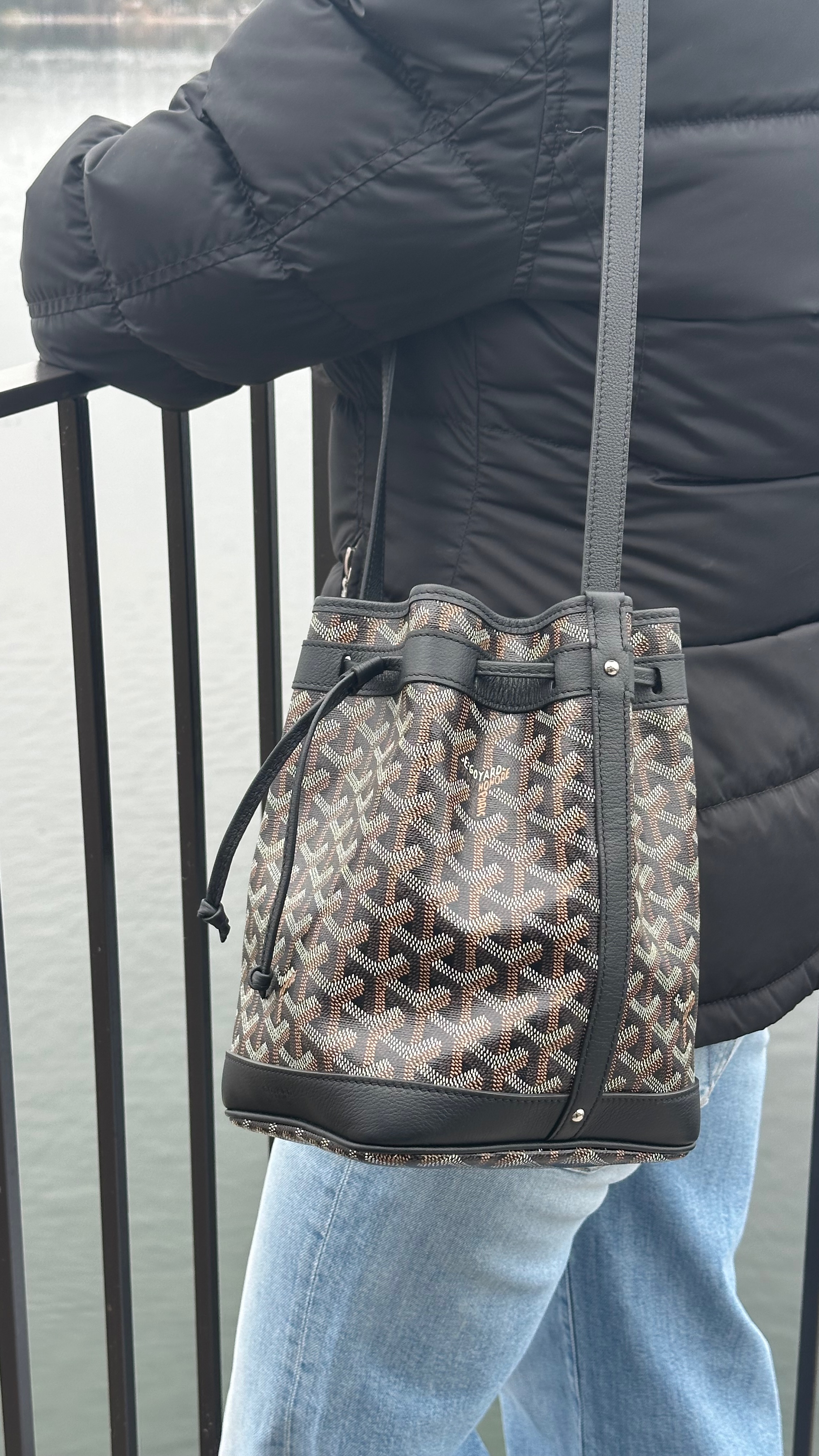 Goyard Goyardine Petit Flot PM Bucket Bag. Black goyardine coated canvas, black leather details, silver toned hardware. Bucket style bag with leather string closure at top. Adjustable leather shoulder strap adjusts inside. Serial number 020244, bag produced 2024.