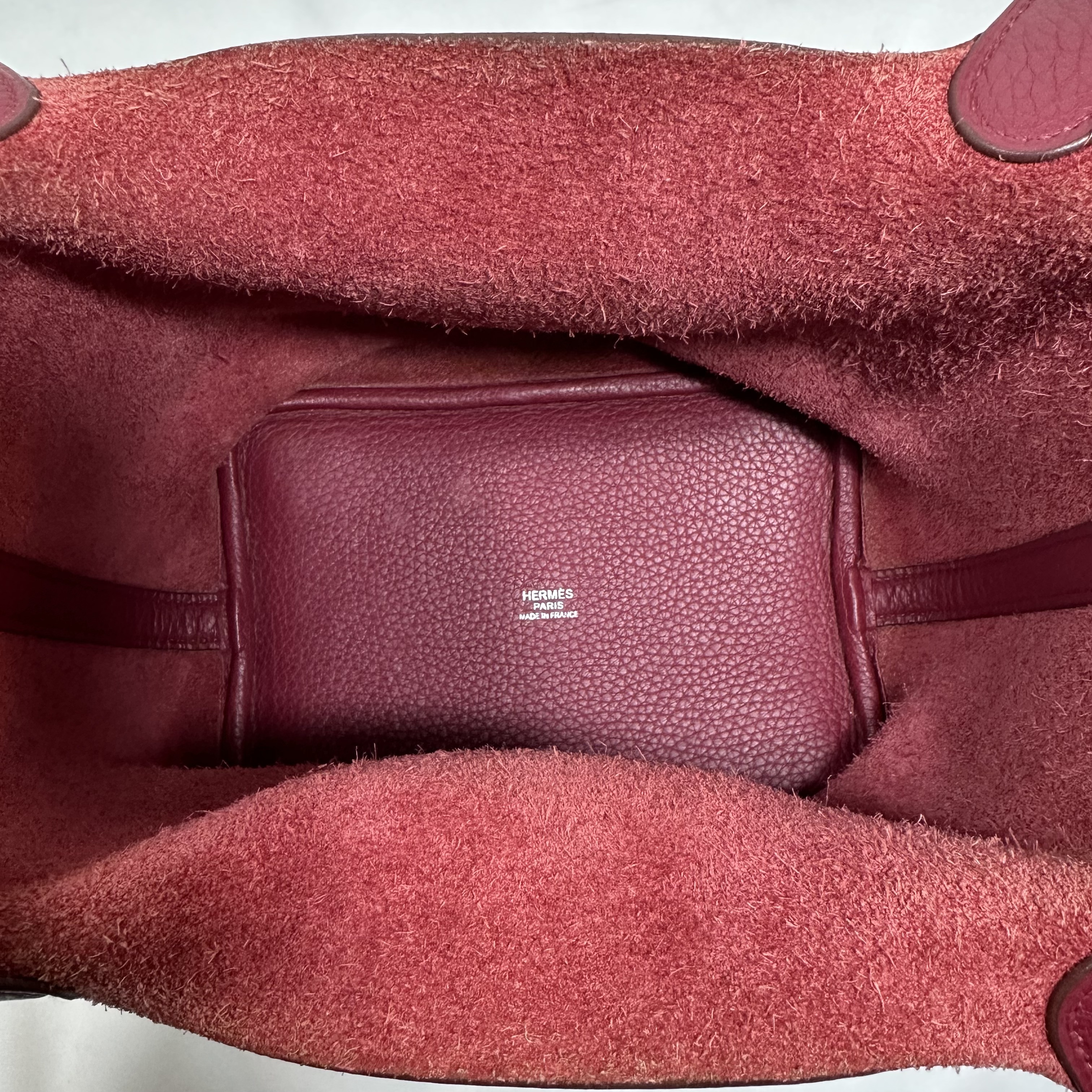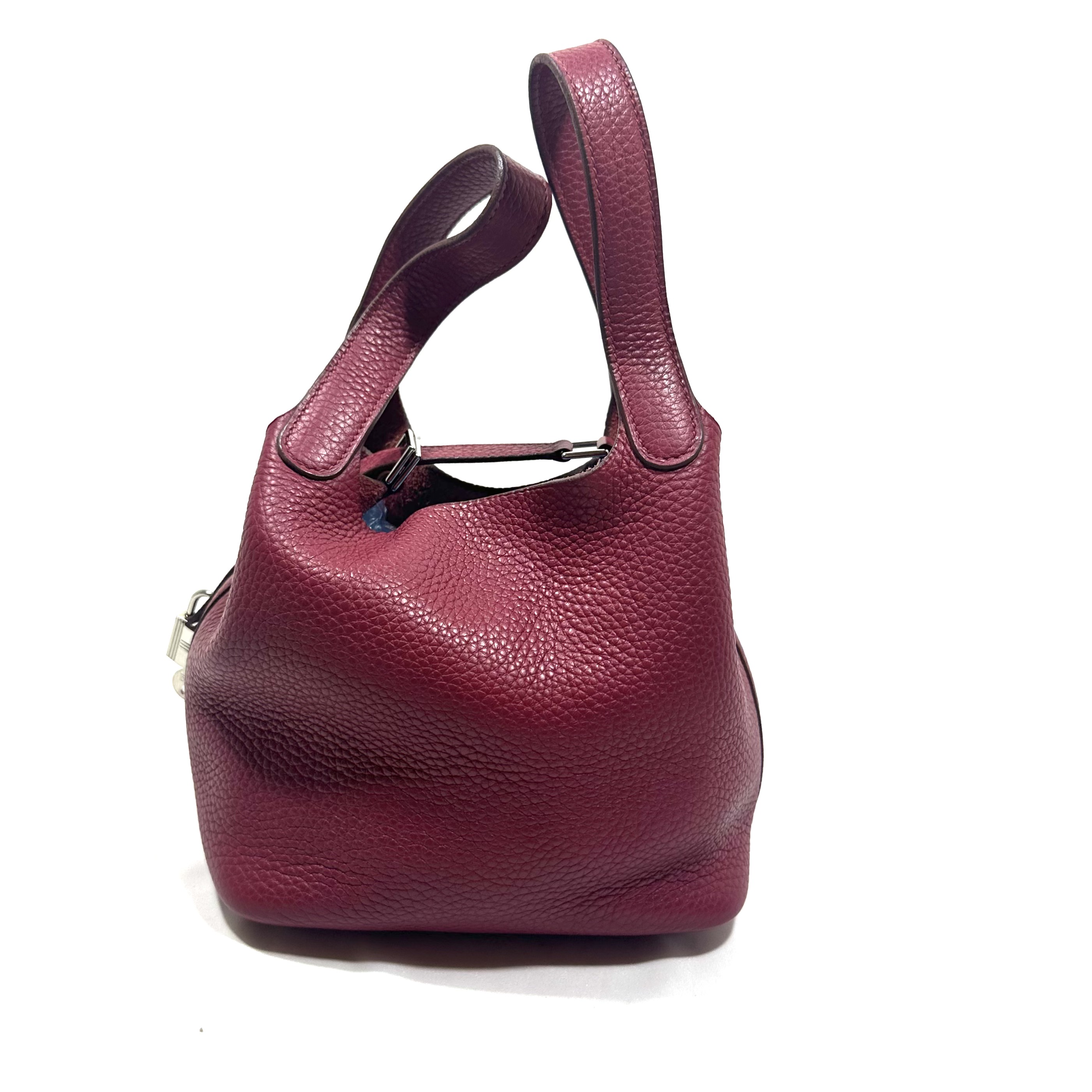 Hermès Picotin18. Dark red/ bordeaux coloured Clemence leather, palladium (silver toned) hardware. Top handles, leather strap crossover for closure. Padlock and key included, number 120. Date code R in Square i.e 2014.