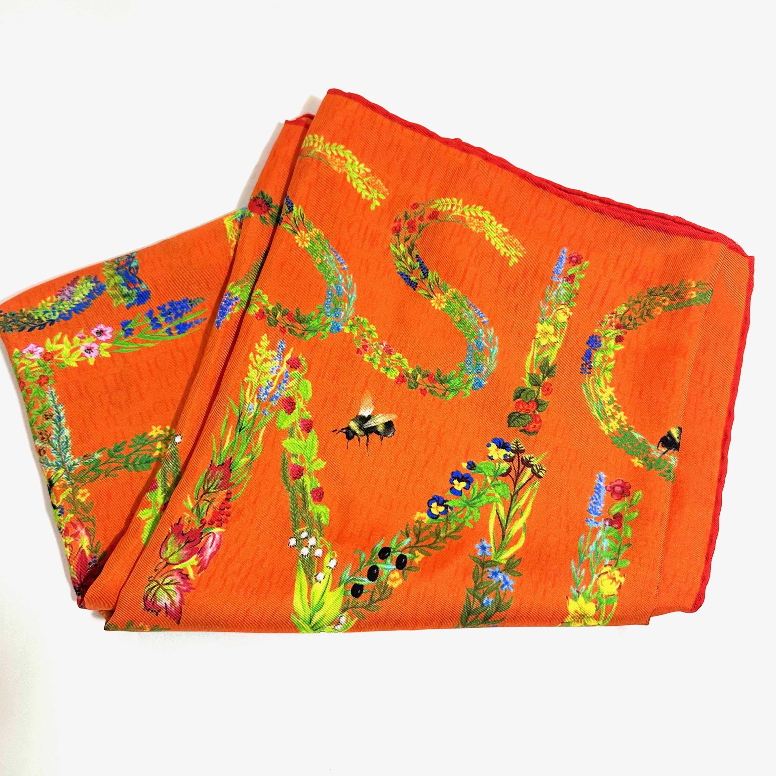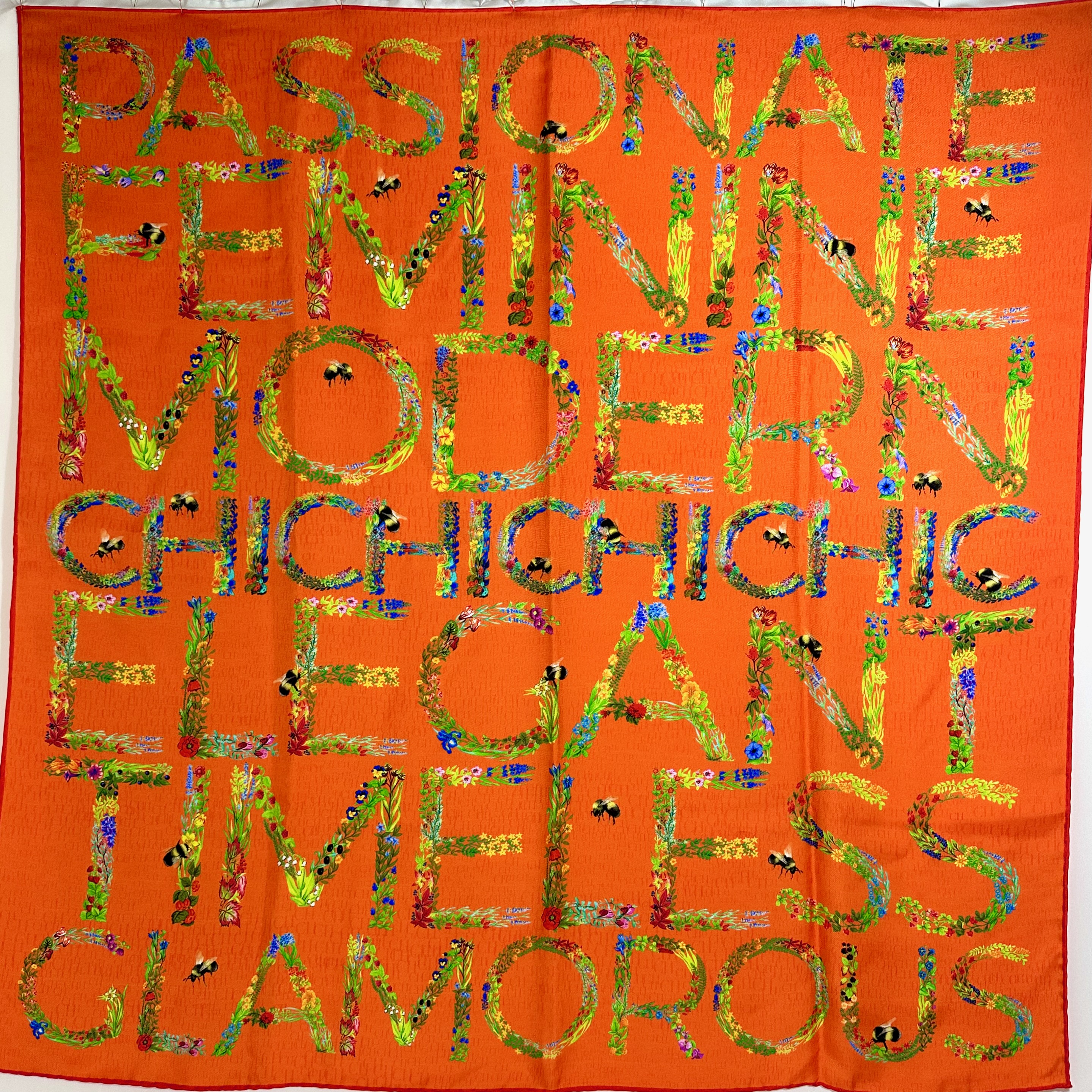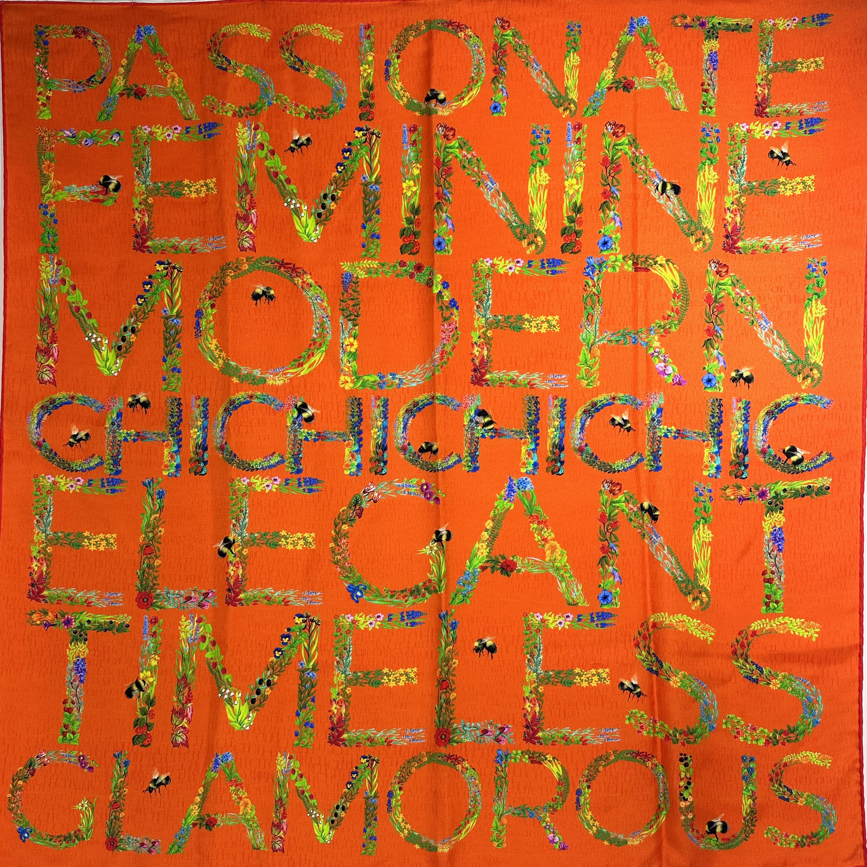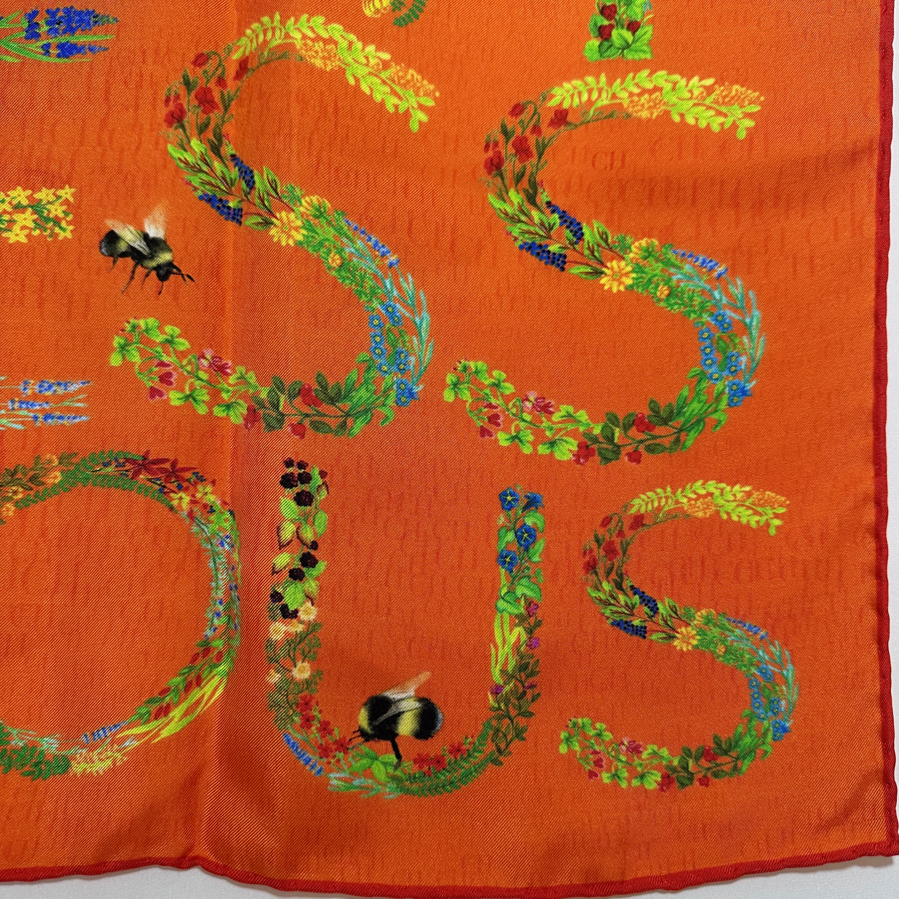 Carolina Herrera 90 Orange Silk Carré Scarf. Floral text on orange base. CH logo on base. 100% silk. Size 90 x 90, rolled edges.