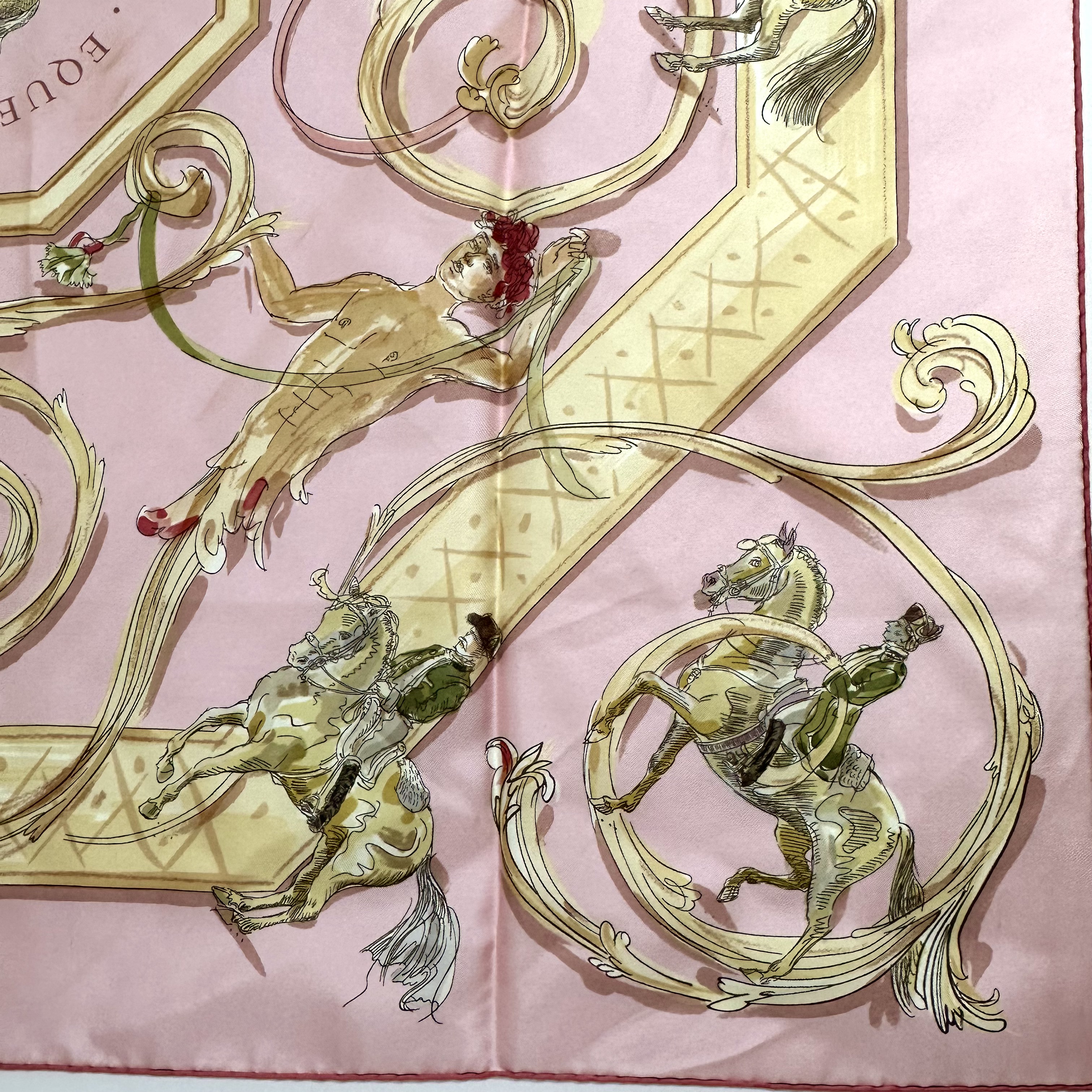 Hermès 90 Rosa Siden Carré Scarf. “Ecole Portugaise D’Art Equestre”, designad av Philippe Dumas år 2006.