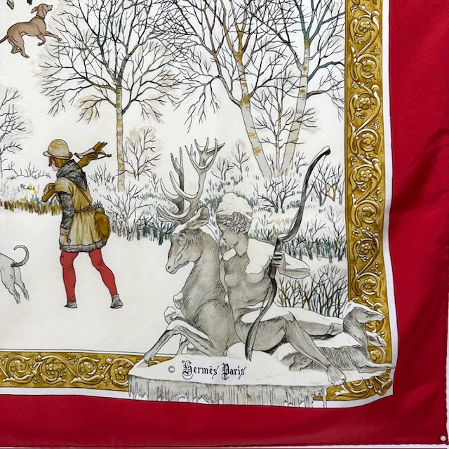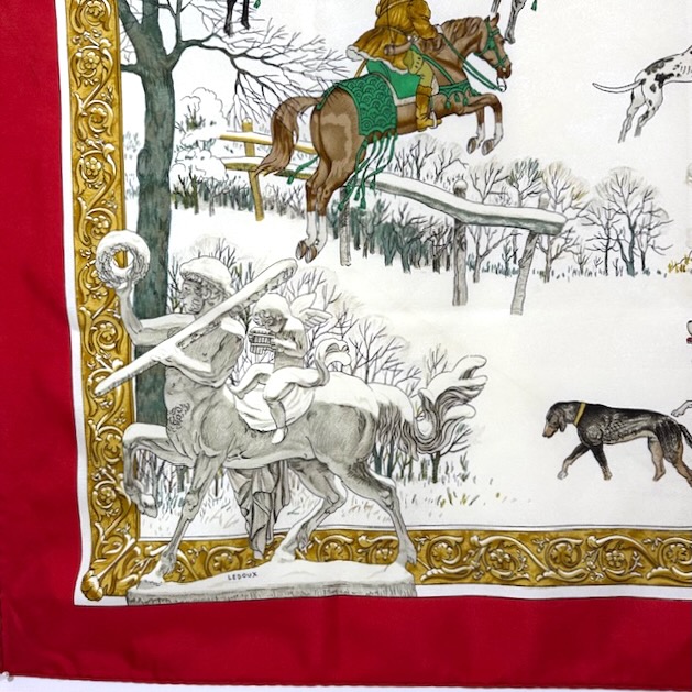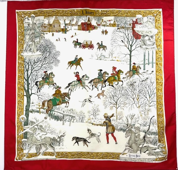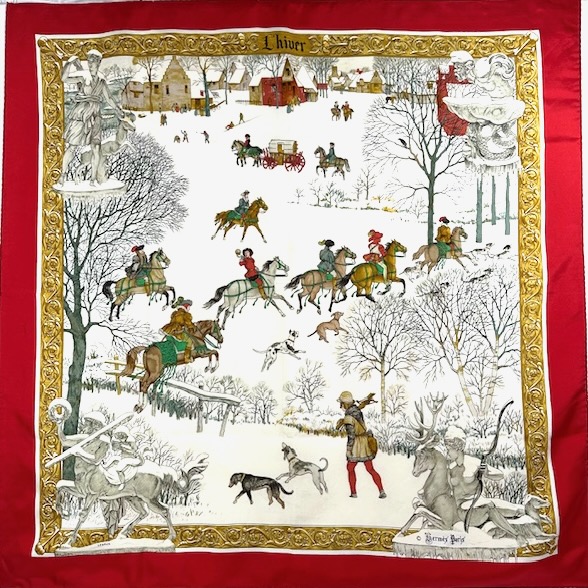 Hermès röd 90 silkescarré “L’Hiver”. Design av Philippe Ledoux. Originaldesign från 1968. 100 % siden, handrullade kanter. Storlek 89 x 89 cm. Röd och guldfärgad kant med hästar i rörelse i ett vinterlandskap på vit botten.