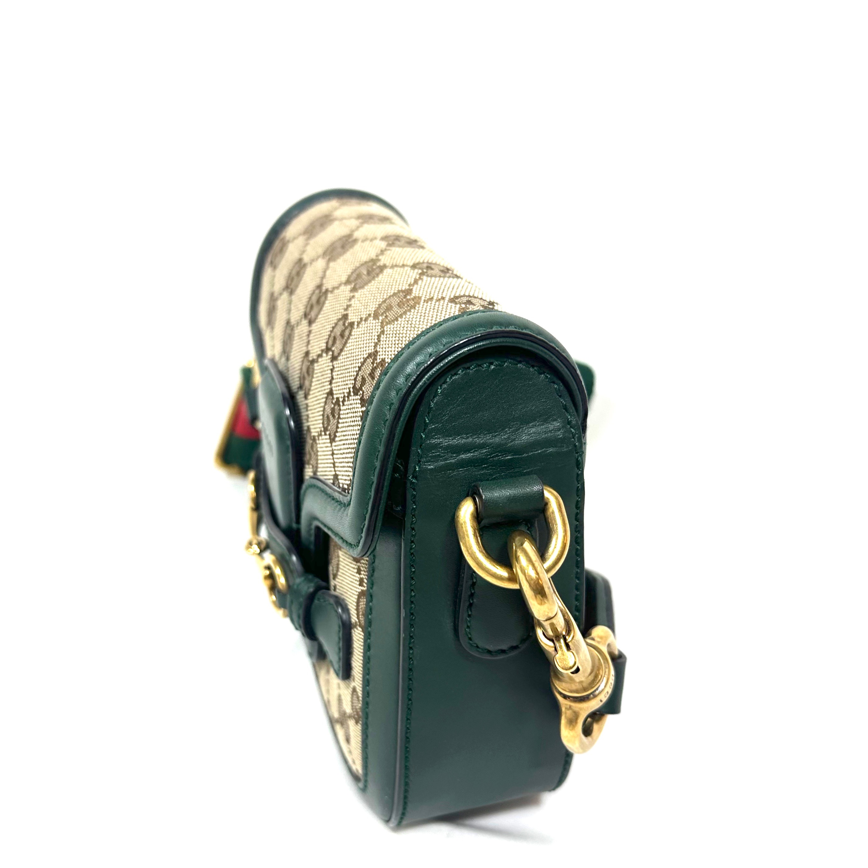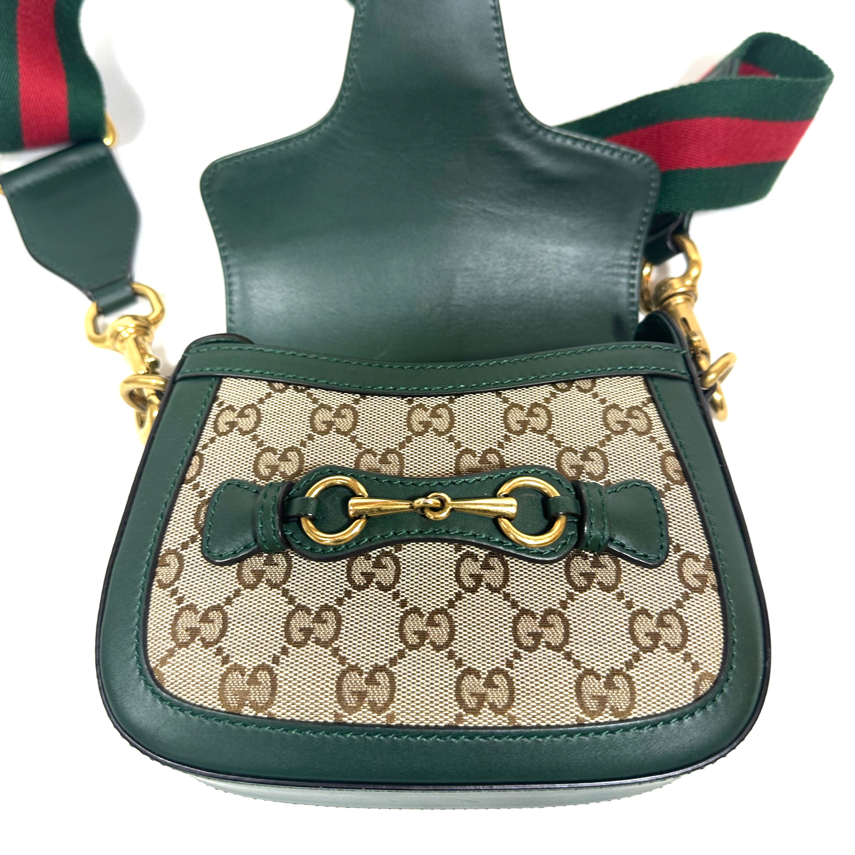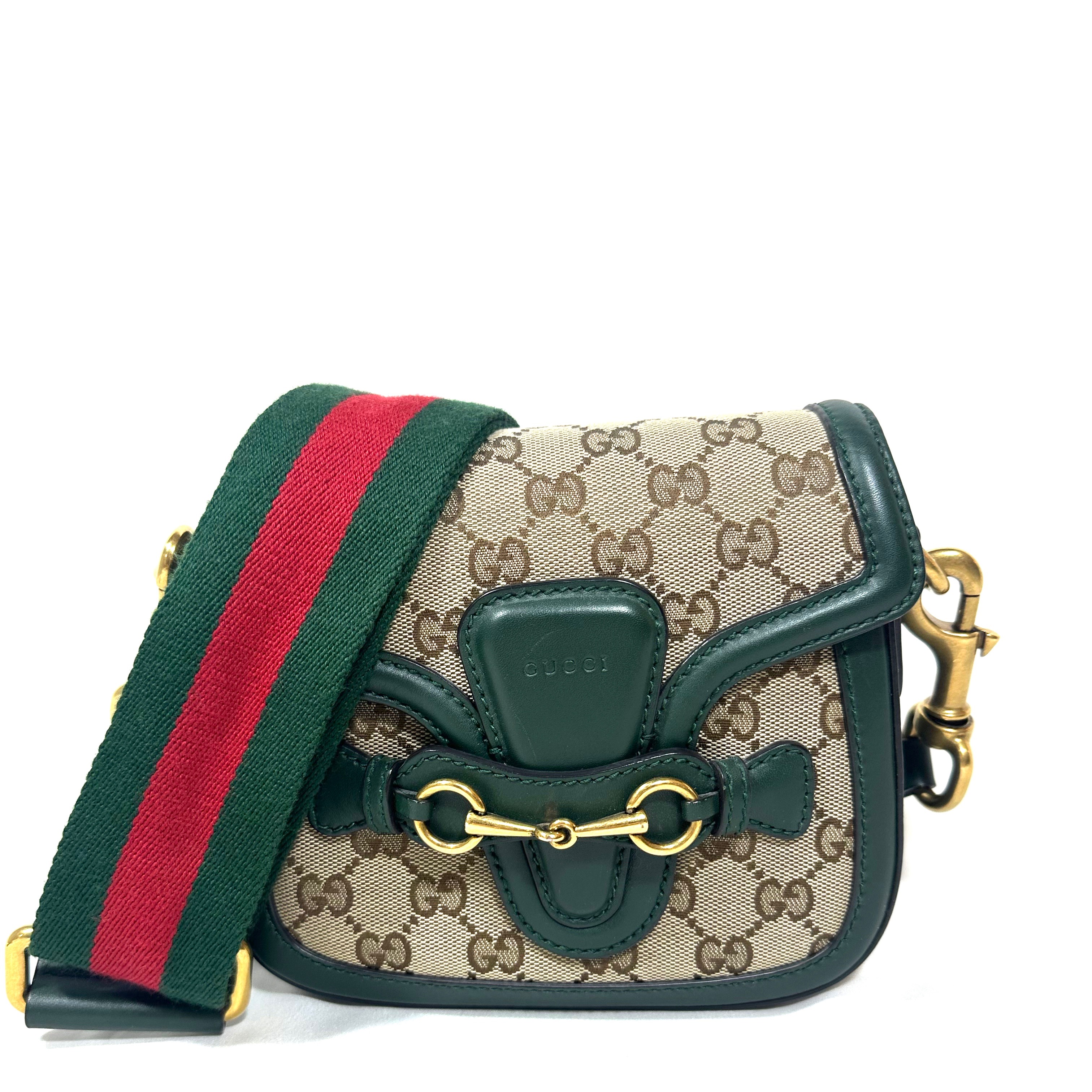 Gucci Small GG Canvas Lady Web Crossbody Bag. GG Ebony canvas med grön läder kantning och detaljer, samt klassisk röd/grön axelrem i tyg. Åldrat guld-/bronstons färgad hårdvara. Stängs framtill under läderrem under hästbetsel i metall. Axelremmen är avtagbar. ID 384821 000926.
