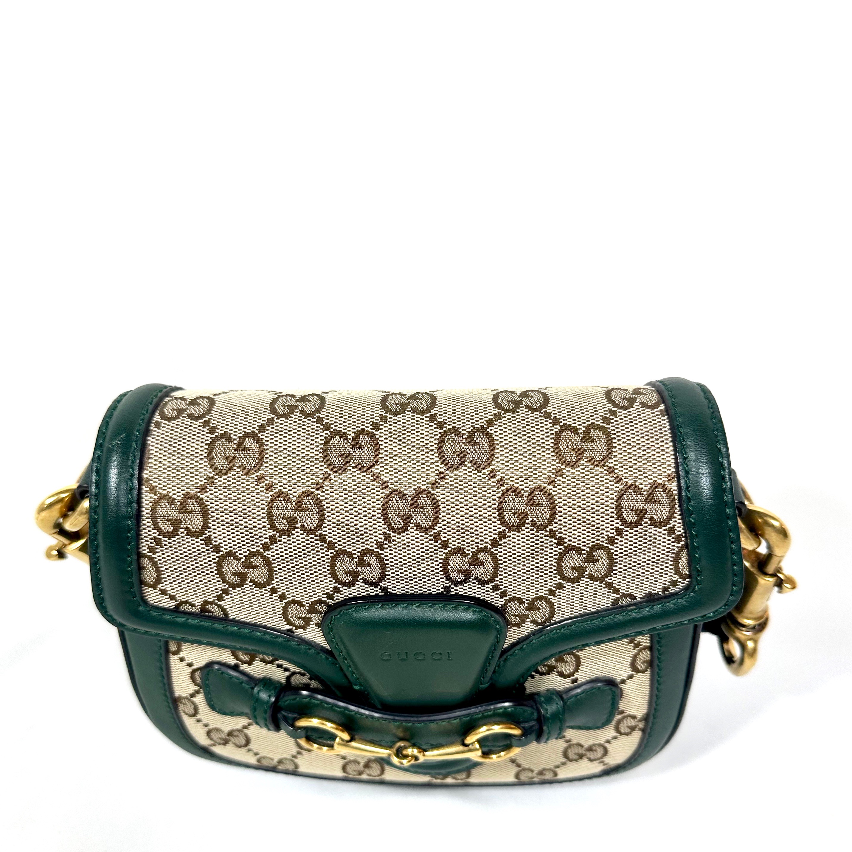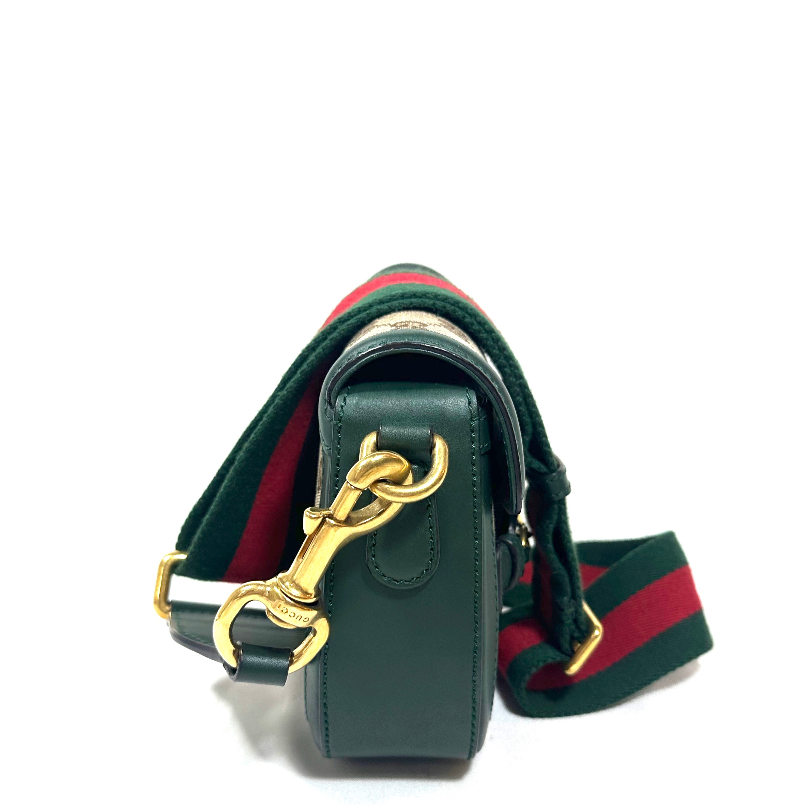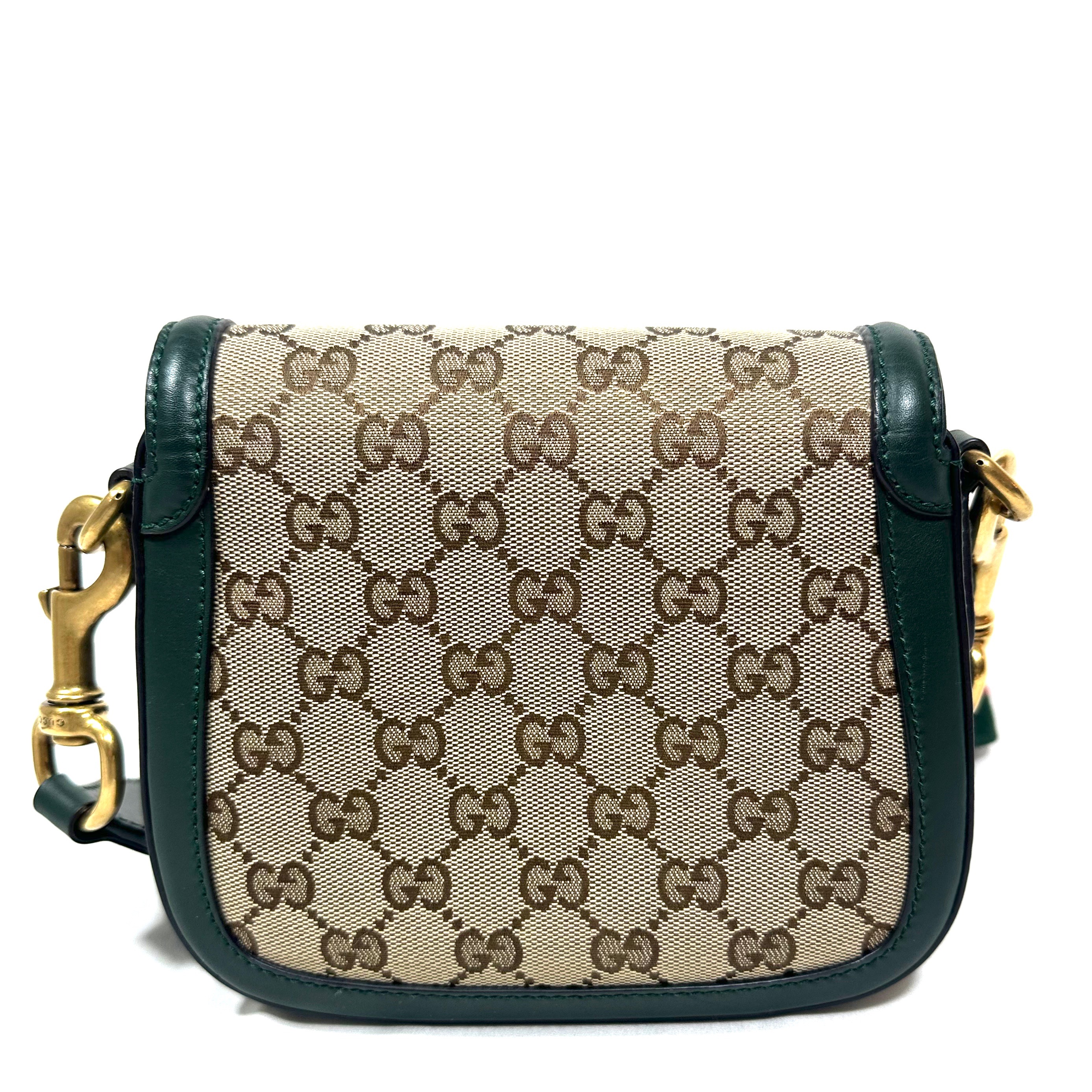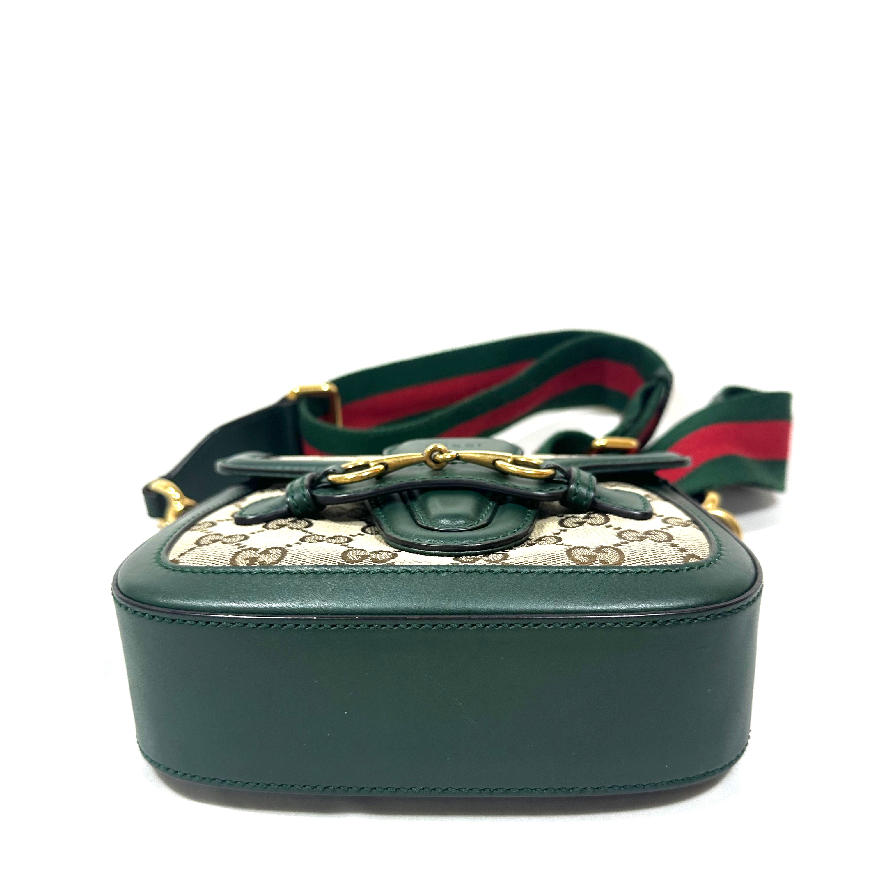 Gucci Small GG Canvas Lady Web Crossbody Bag. GG Ebony canvas med grön läder kantning och detaljer, samt klassisk röd/grön axelrem i tyg. Åldrat guld-/bronstons färgad hårdvara. Stängs framtill under läderrem under hästbetsel i metall. Axelremmen är avtagbar. ID 384821 000926.