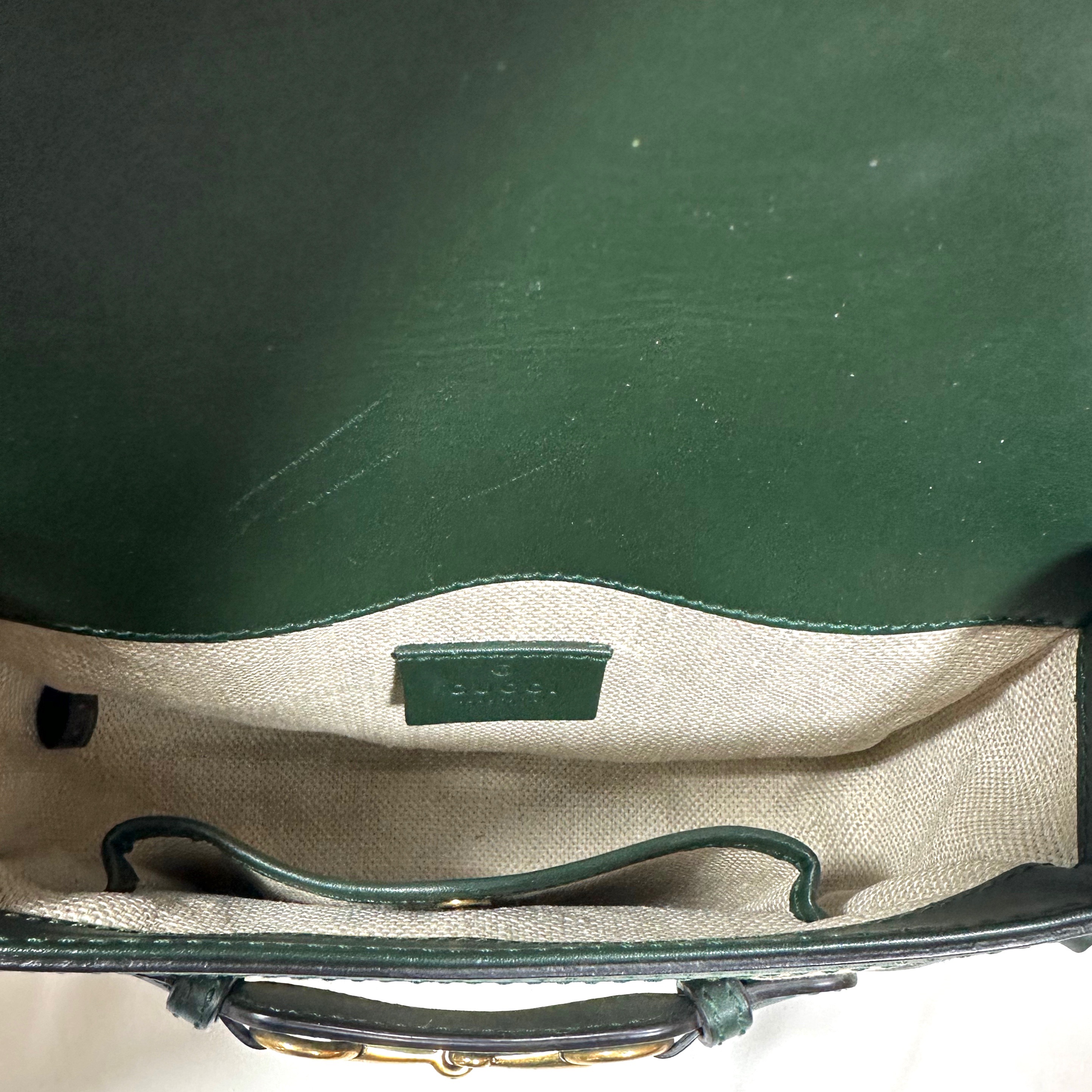 Invändigt: benvitt textilfoder, inga fläckar. Insidan av locket är fodrad med grönt läder och visar vissa repor. En mindre ficka med tryckknappsstängning. Mått: W 19 × H 16 × D 5 cm. Justerbar axelremdrop 34–54 cm. Dustbag ingår.
