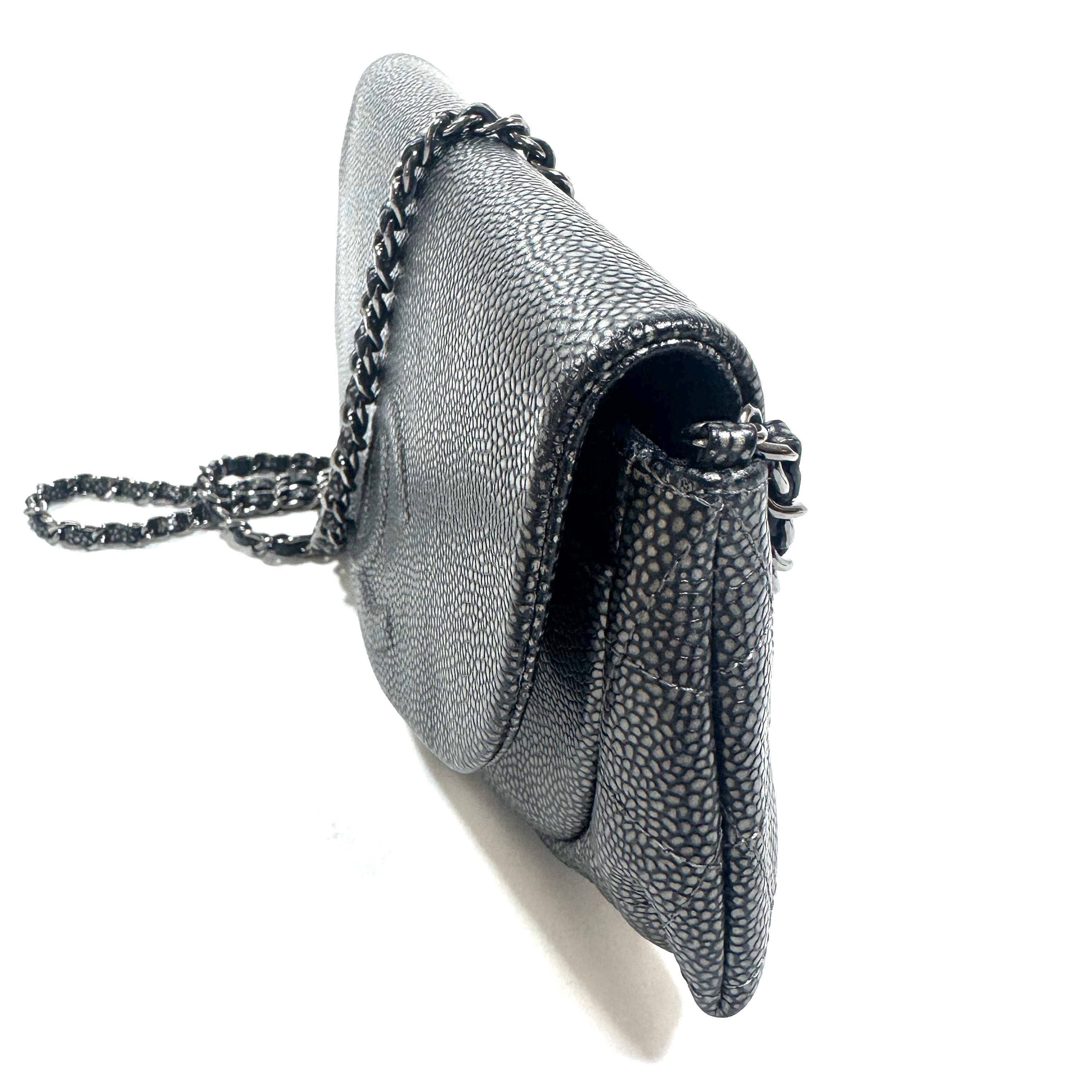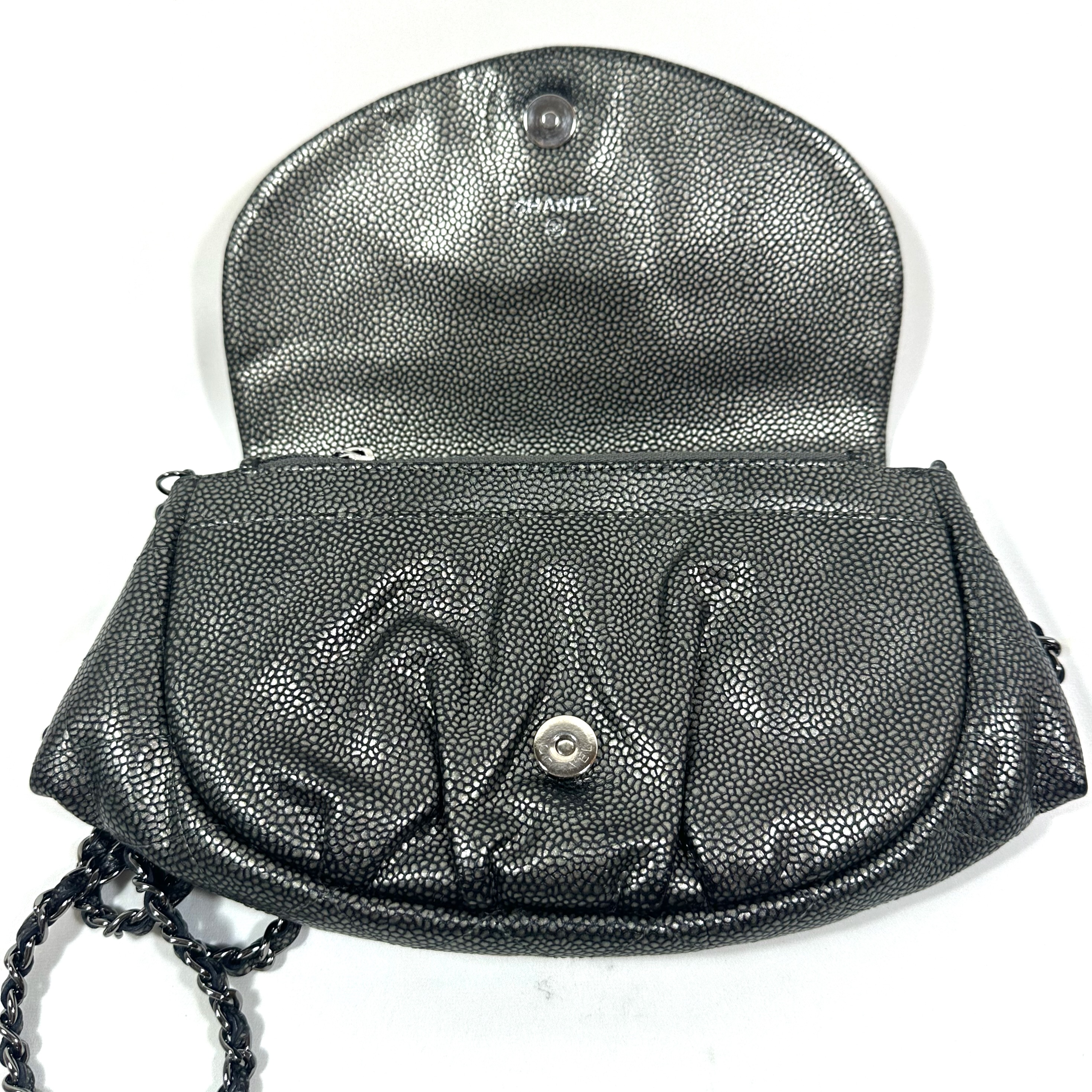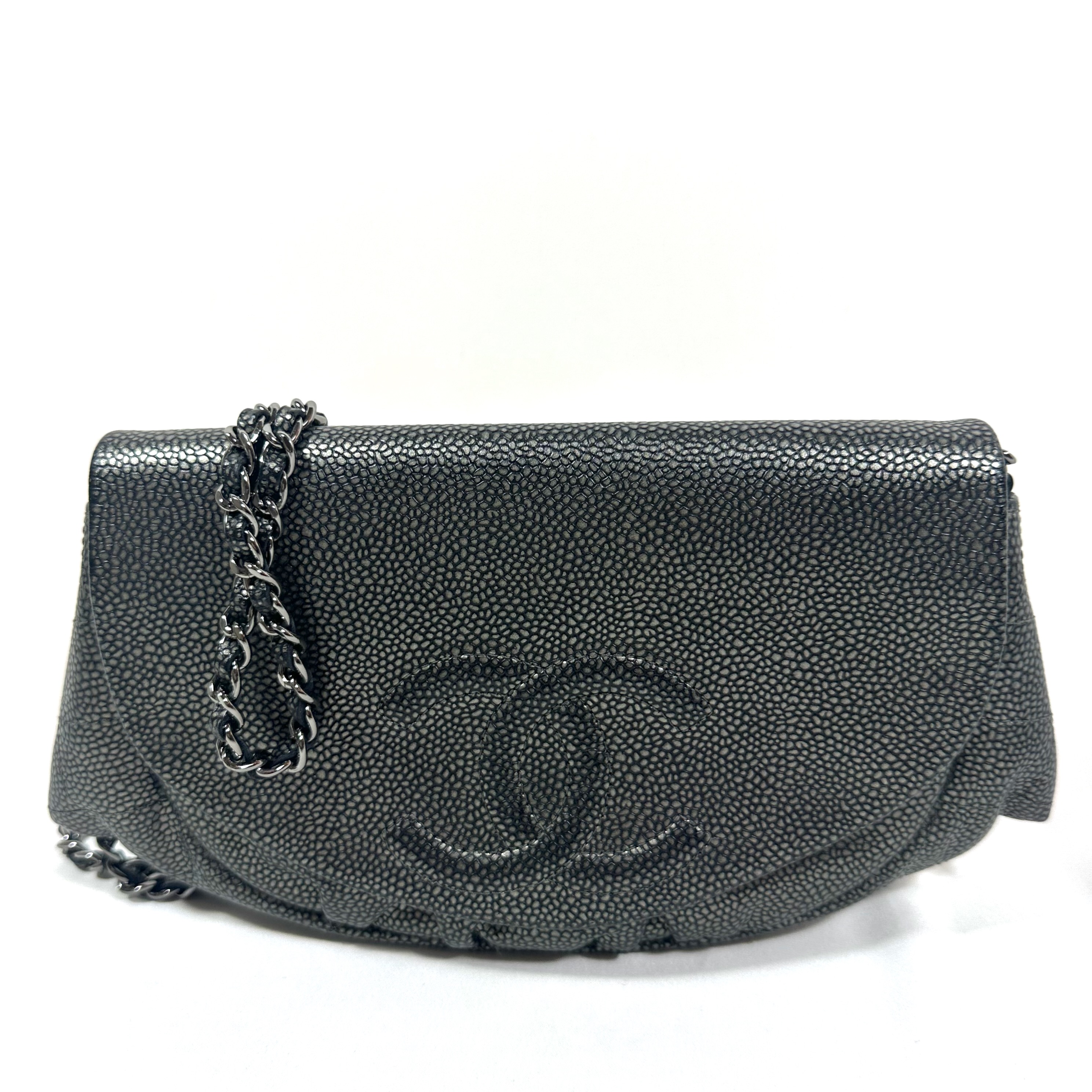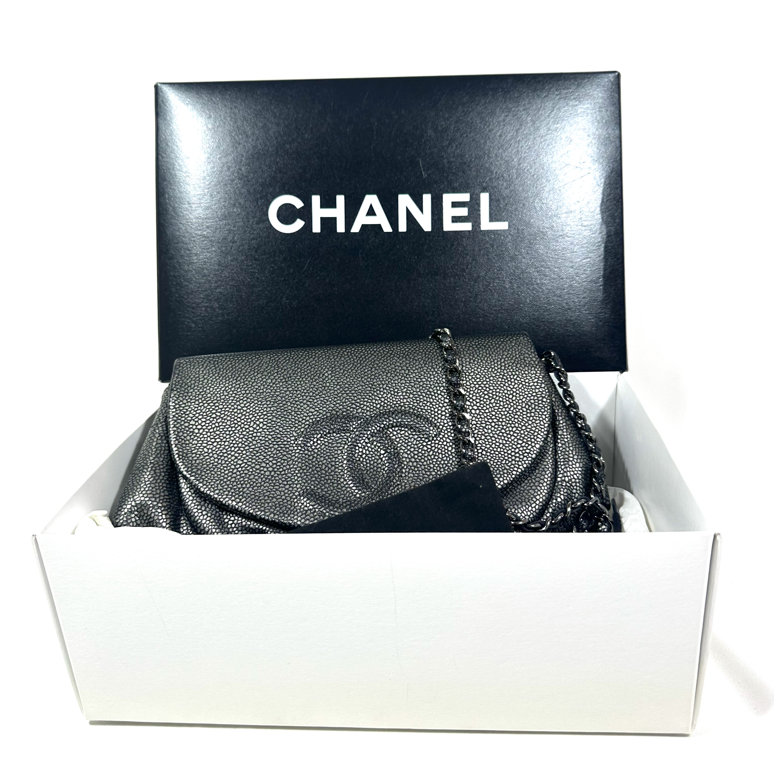 Chanel Wallet on Chain. Svart och silverprickigt läder, silver tonad hårdvara. Klassisk CC logga på framfliken, tryckknappsstängning under. Axelkedja med inflätat läder Datumkod 18622688 (väskan producera 2013–2014).