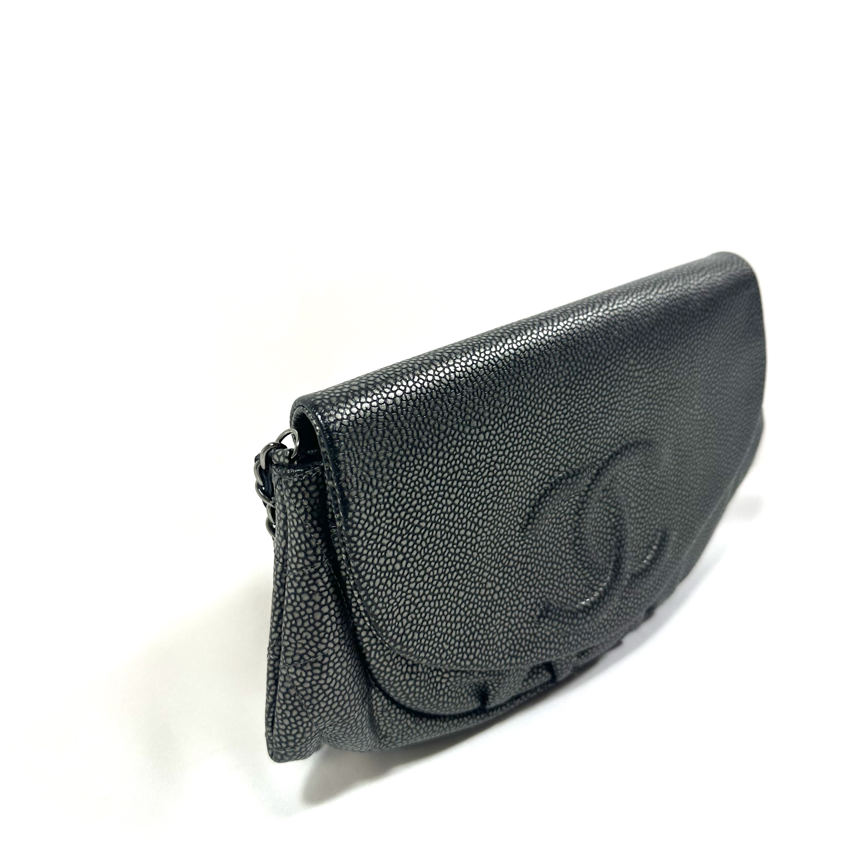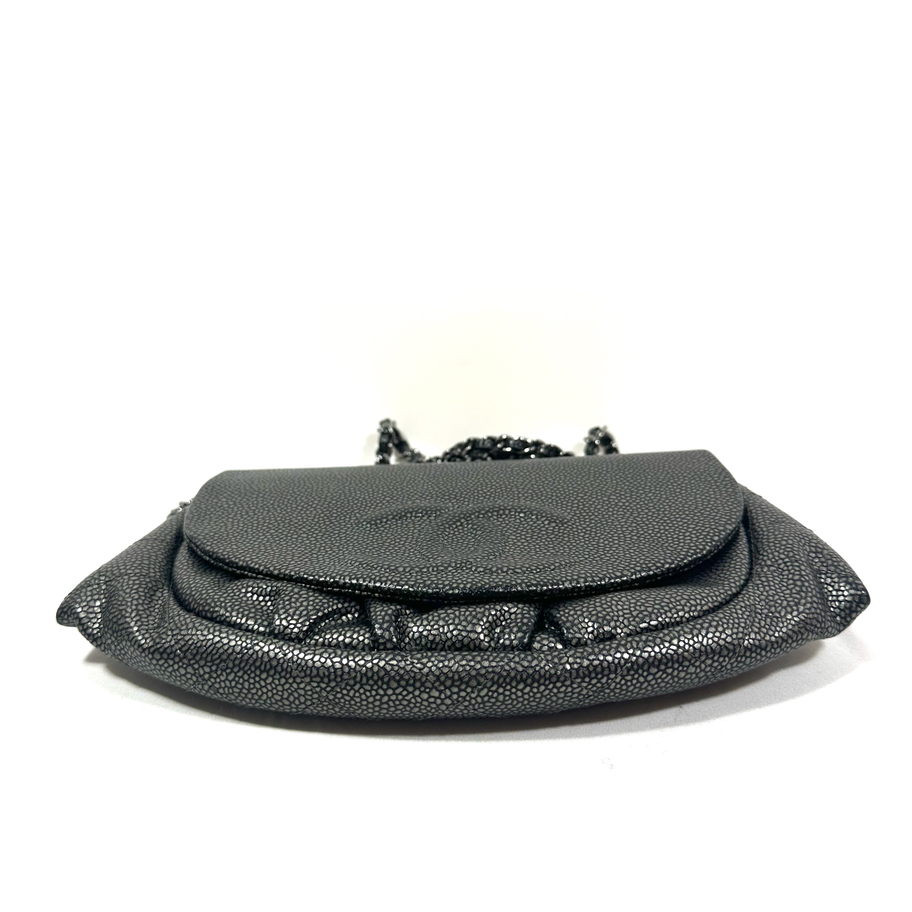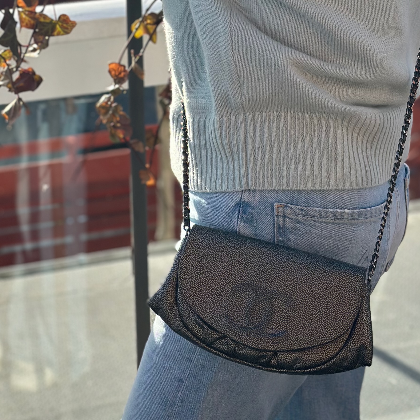 Chanel Wallet on Chain. Svart och silverprickigt läder, silver tonad hårdvara. Klassisk CC logga på framfliken, tryckknappsstängning under. Axelkedja med inflätat läder Datumkod 18622688 (väskan producera 2013–2014).