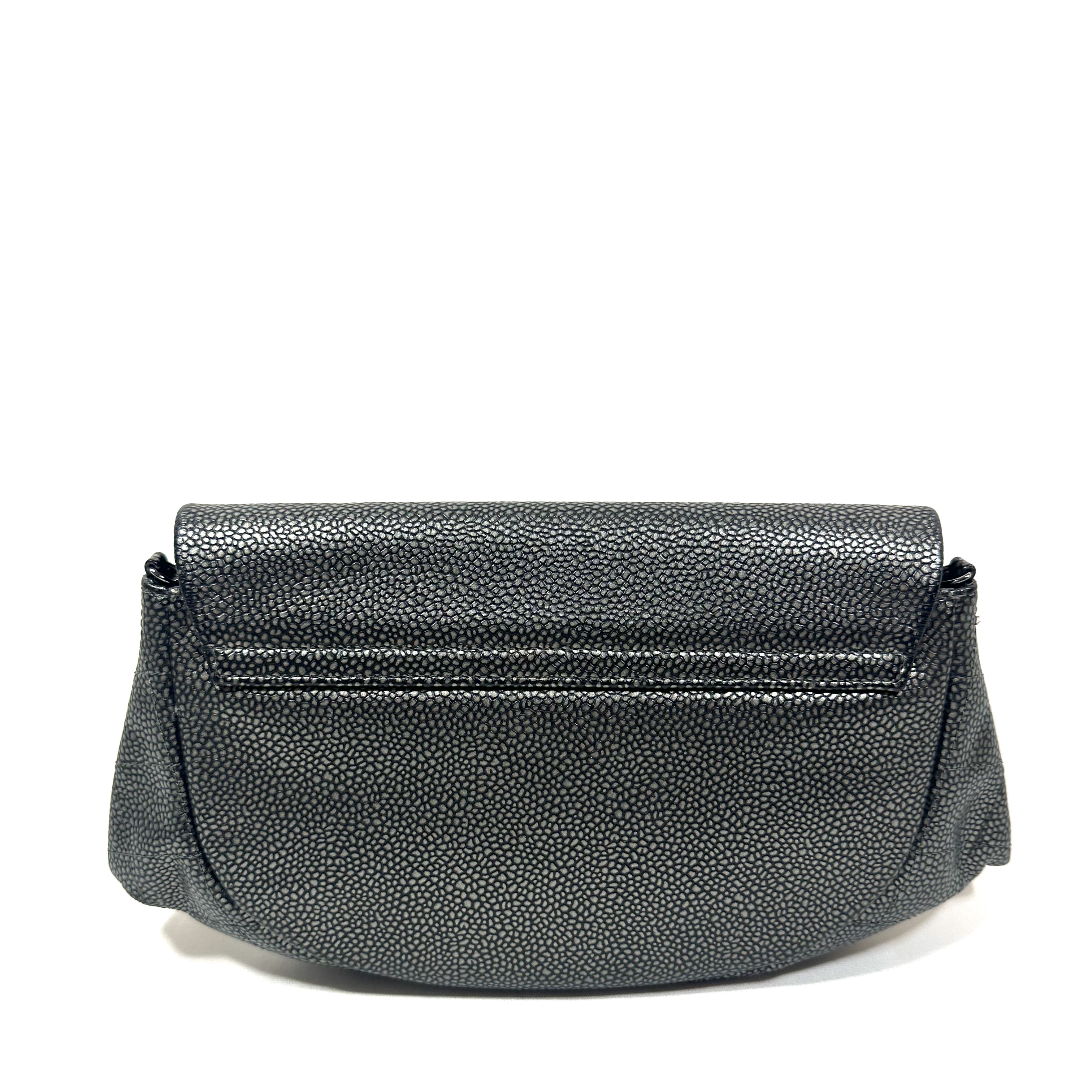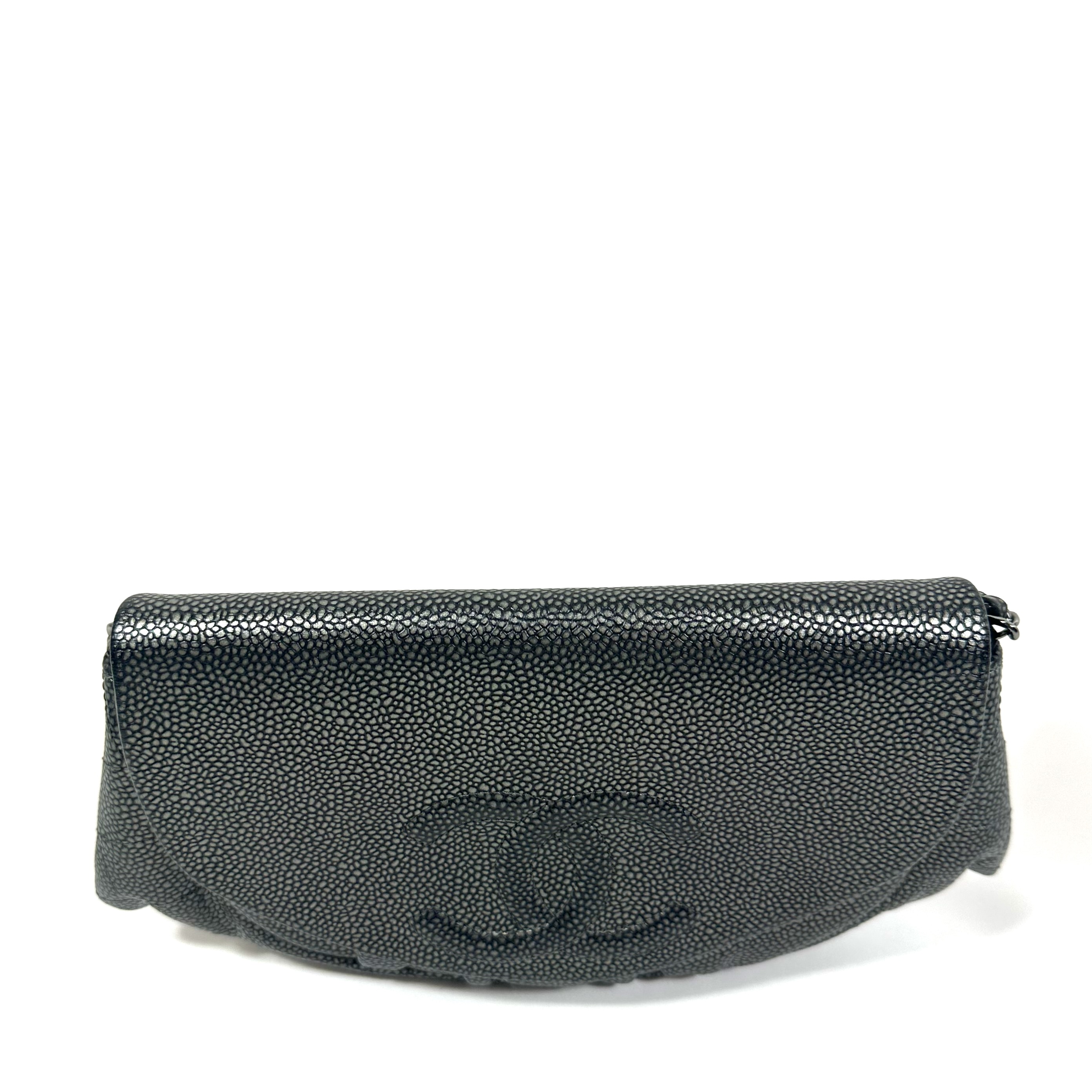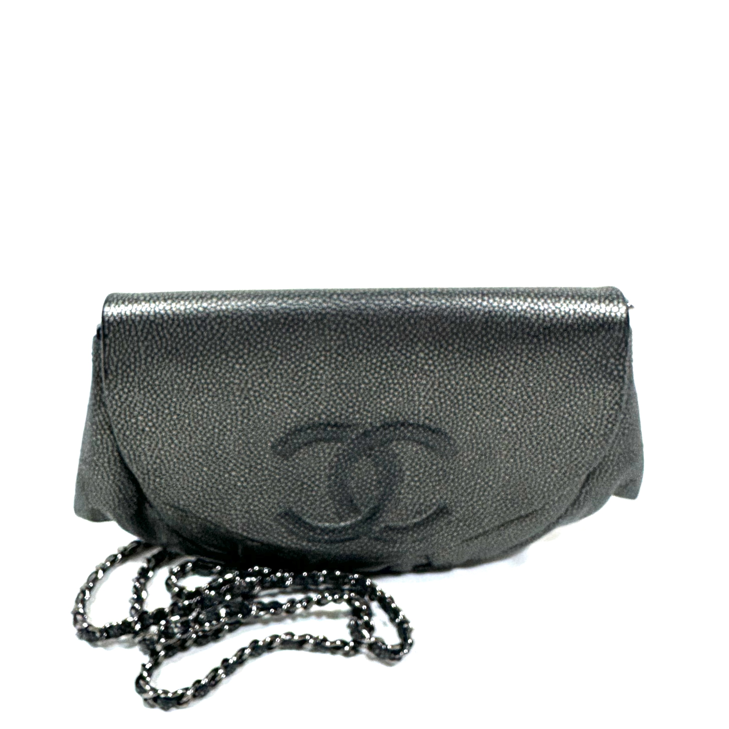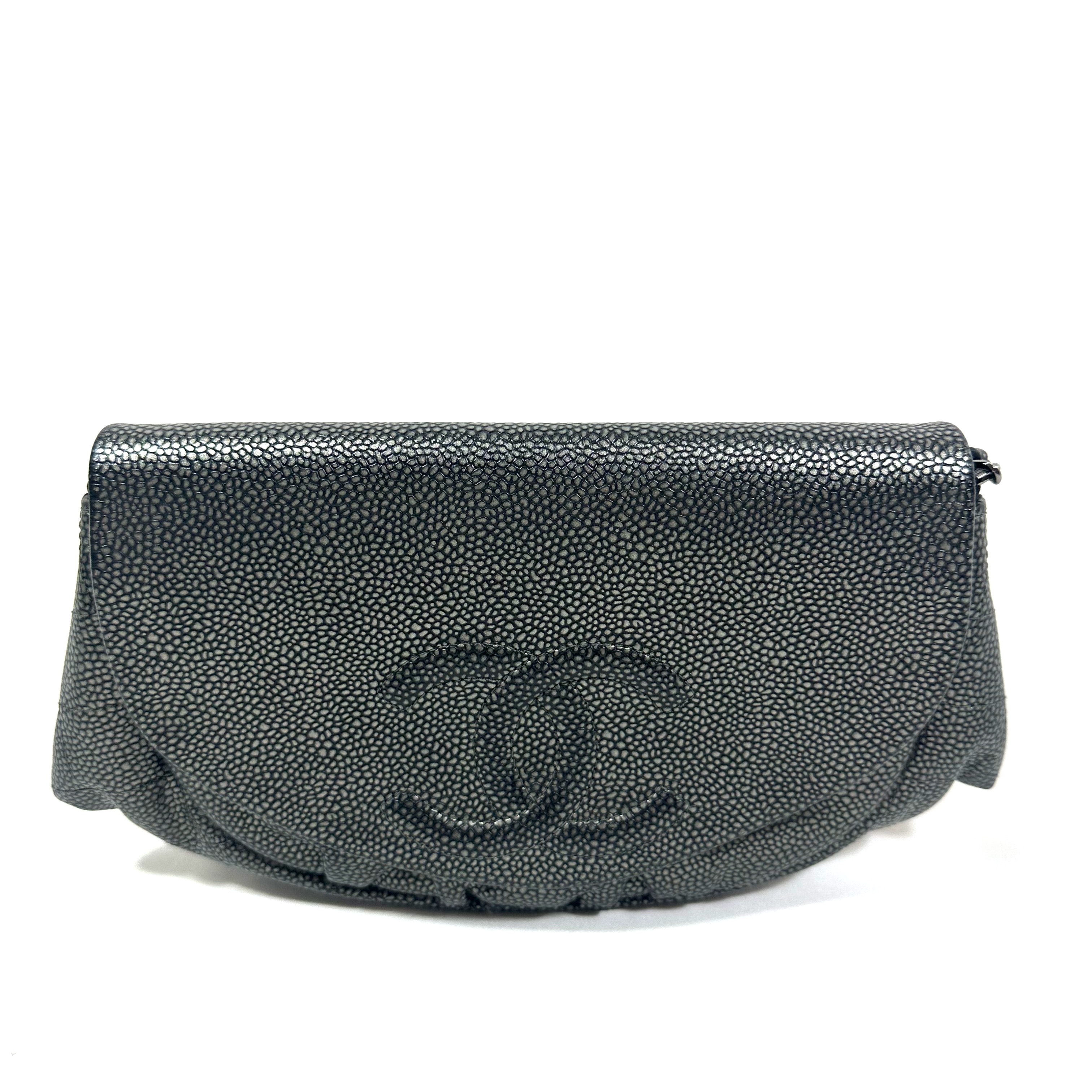 Chanel Wallet on Chain. Svart och silverprickigt läder, silver tonad hårdvara. Klassisk CC logga på framfliken, tryckknappsstängning under. Axelkedja med inflätat läder Datumkod 18622688 (väskan producera 2013–2014).