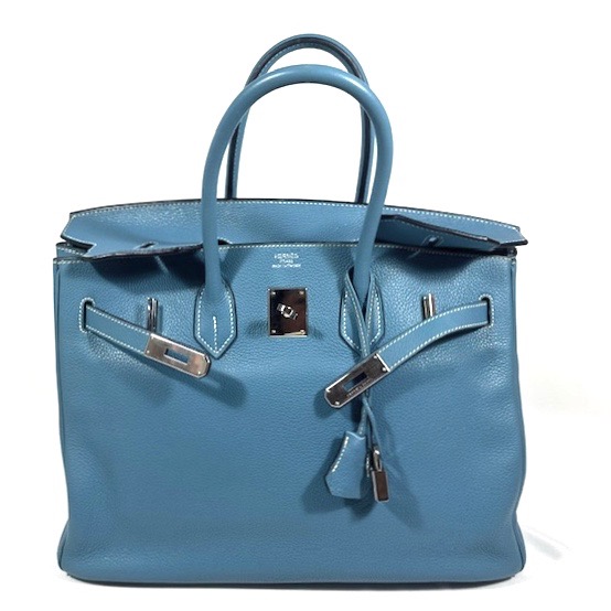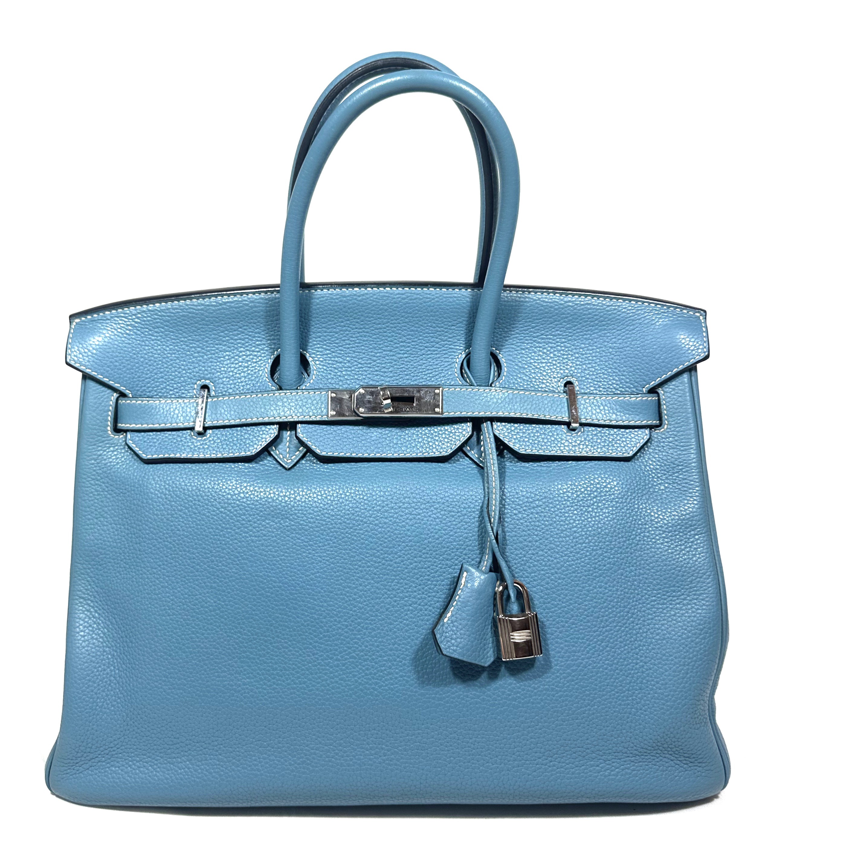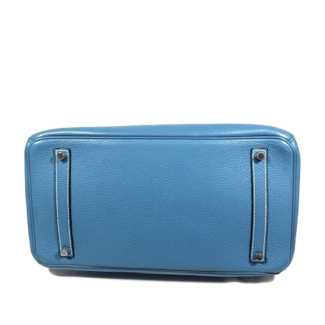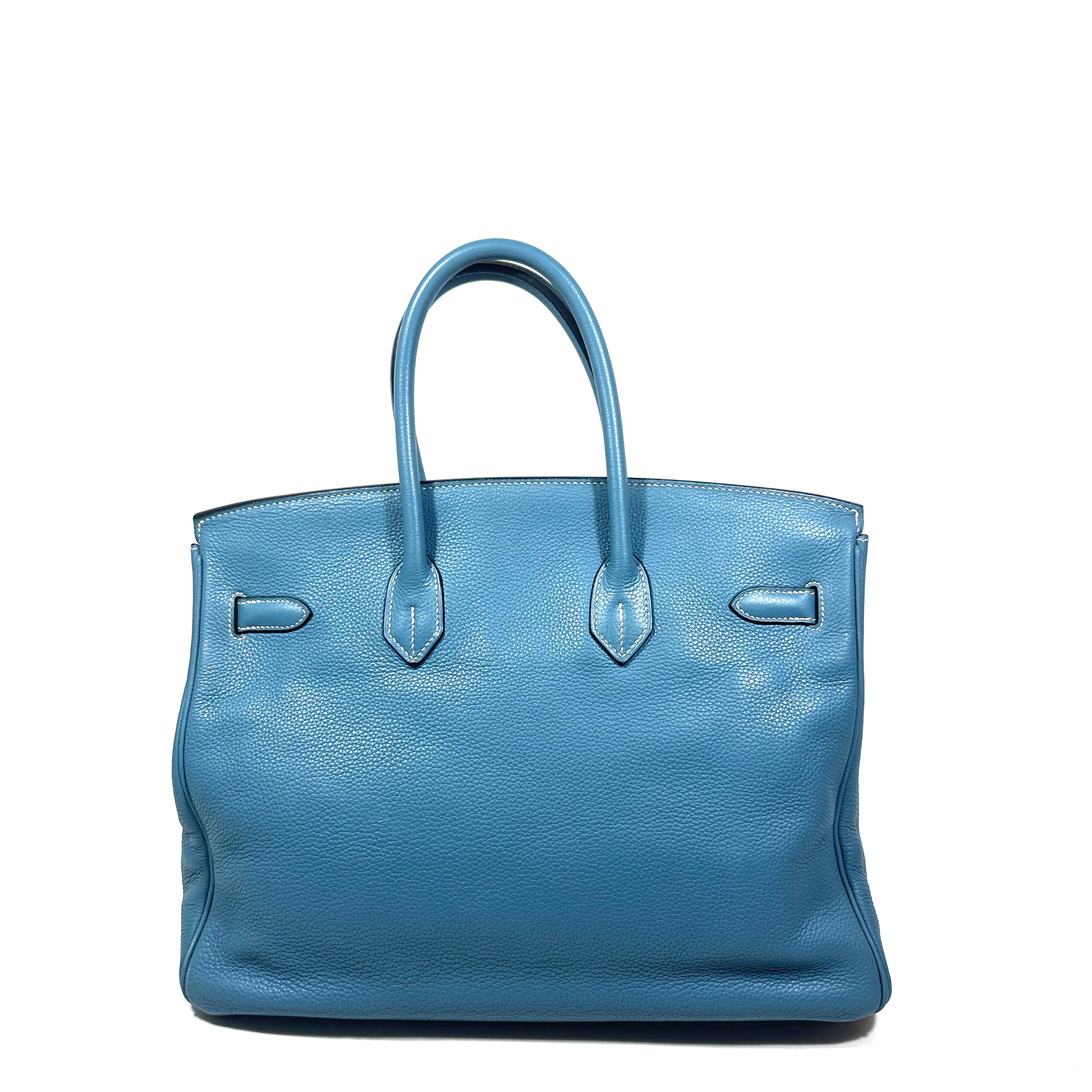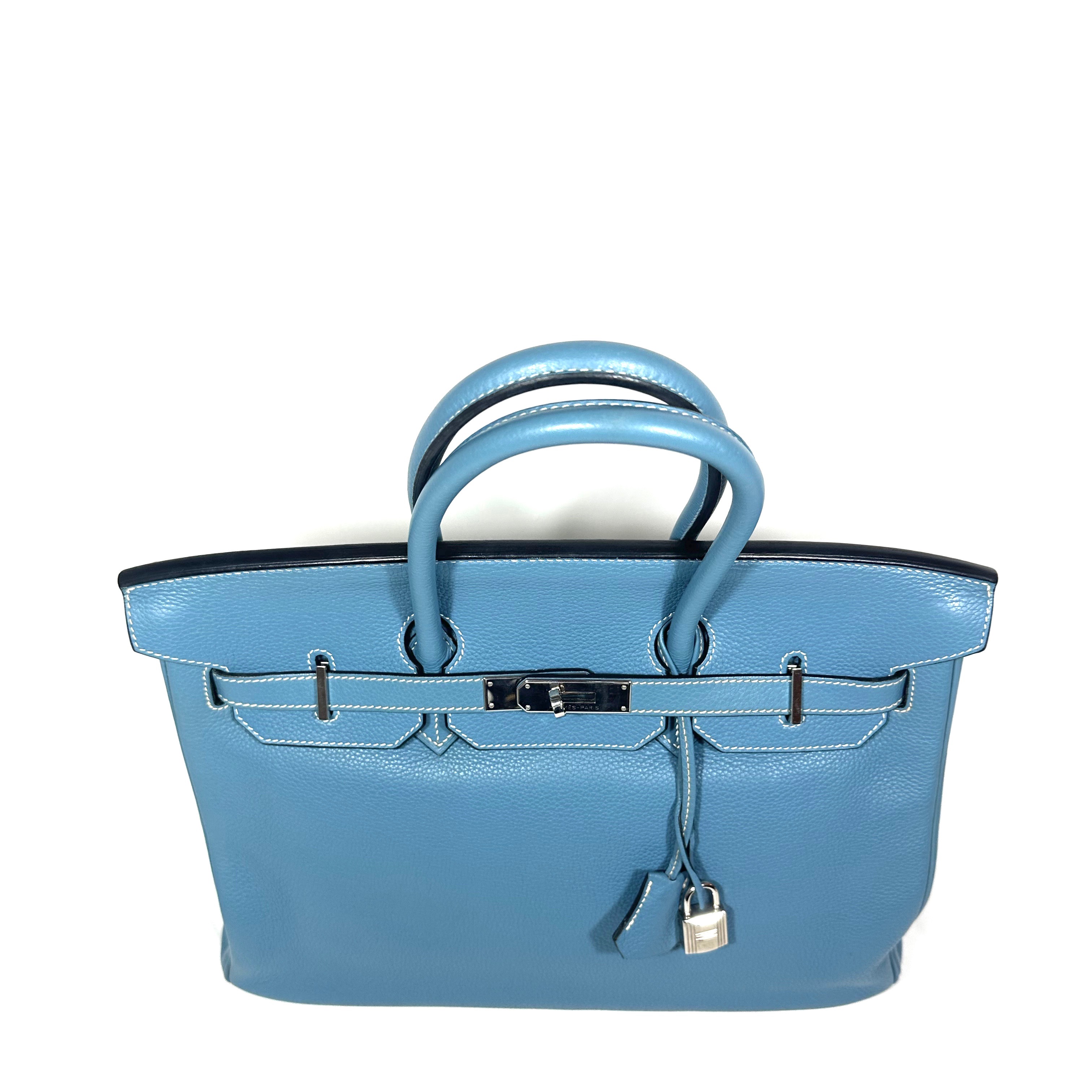 Hermès Birkin 35 Handväska. Bleu Jean togo läder med kontrasterande vita sömmar. Palladium/silvertonad hårdvara, väskan stängs med remmar och , vridlås framtill. Hänglås och en nyckel i clochette medföljer, båda numrerade 117. Metallfötter undertill. Rullade läderhandtag. Datastämpel M i kvadrat, väskan är producerad 2009.