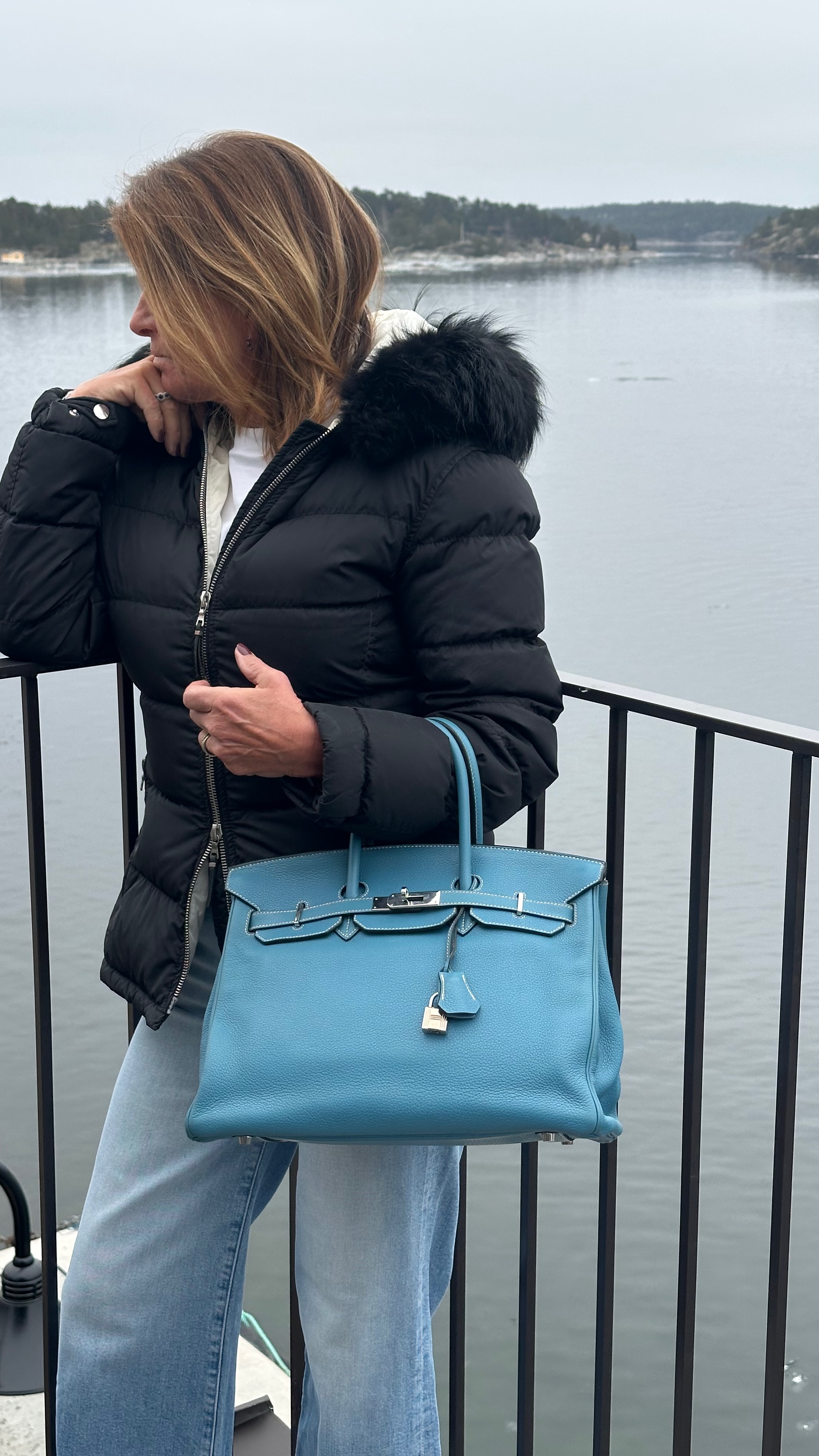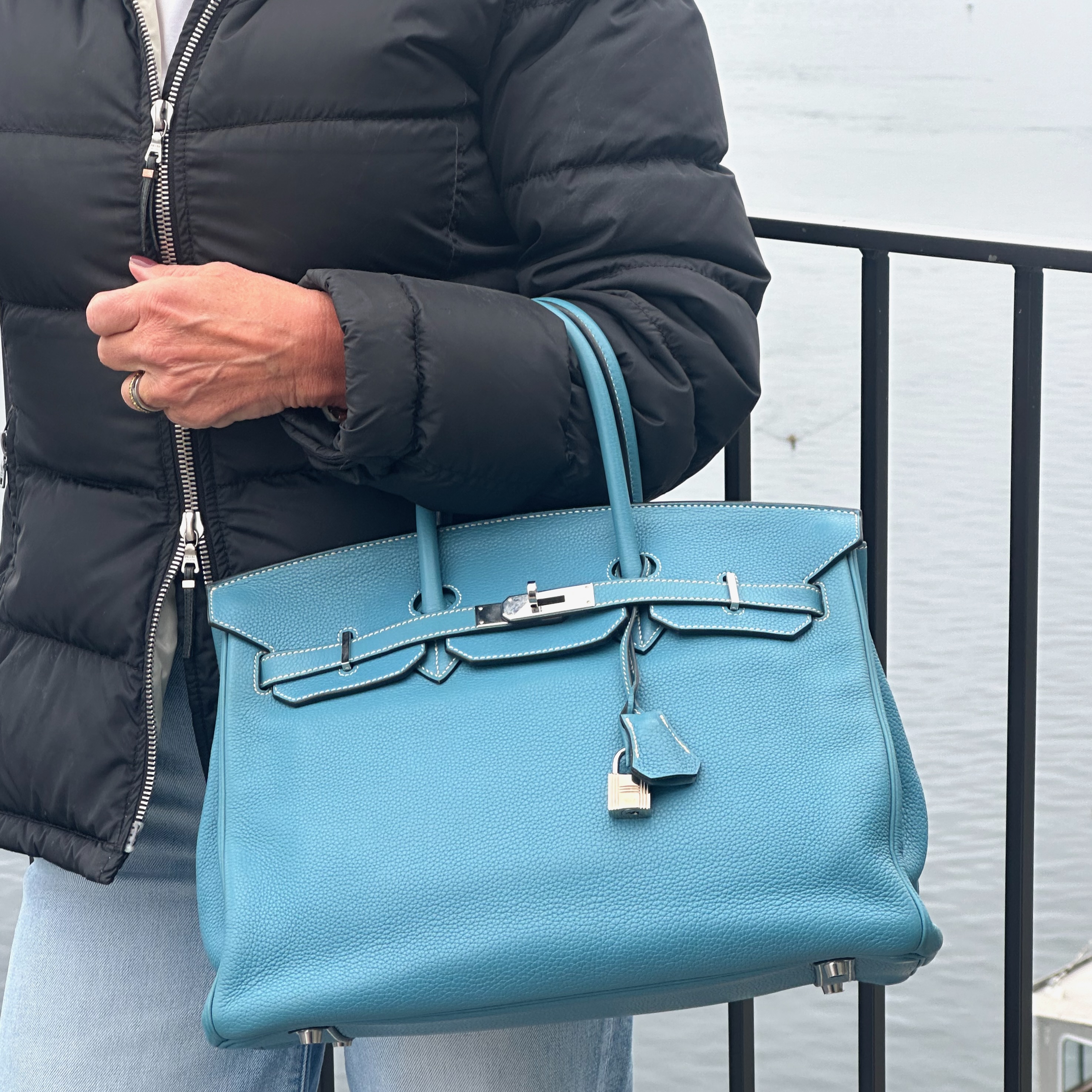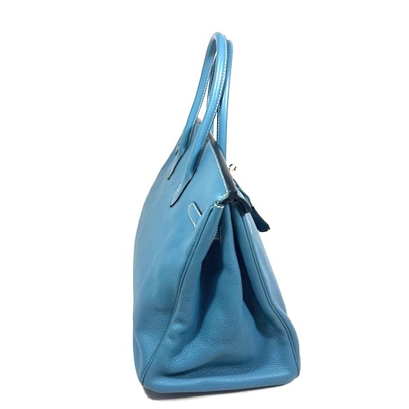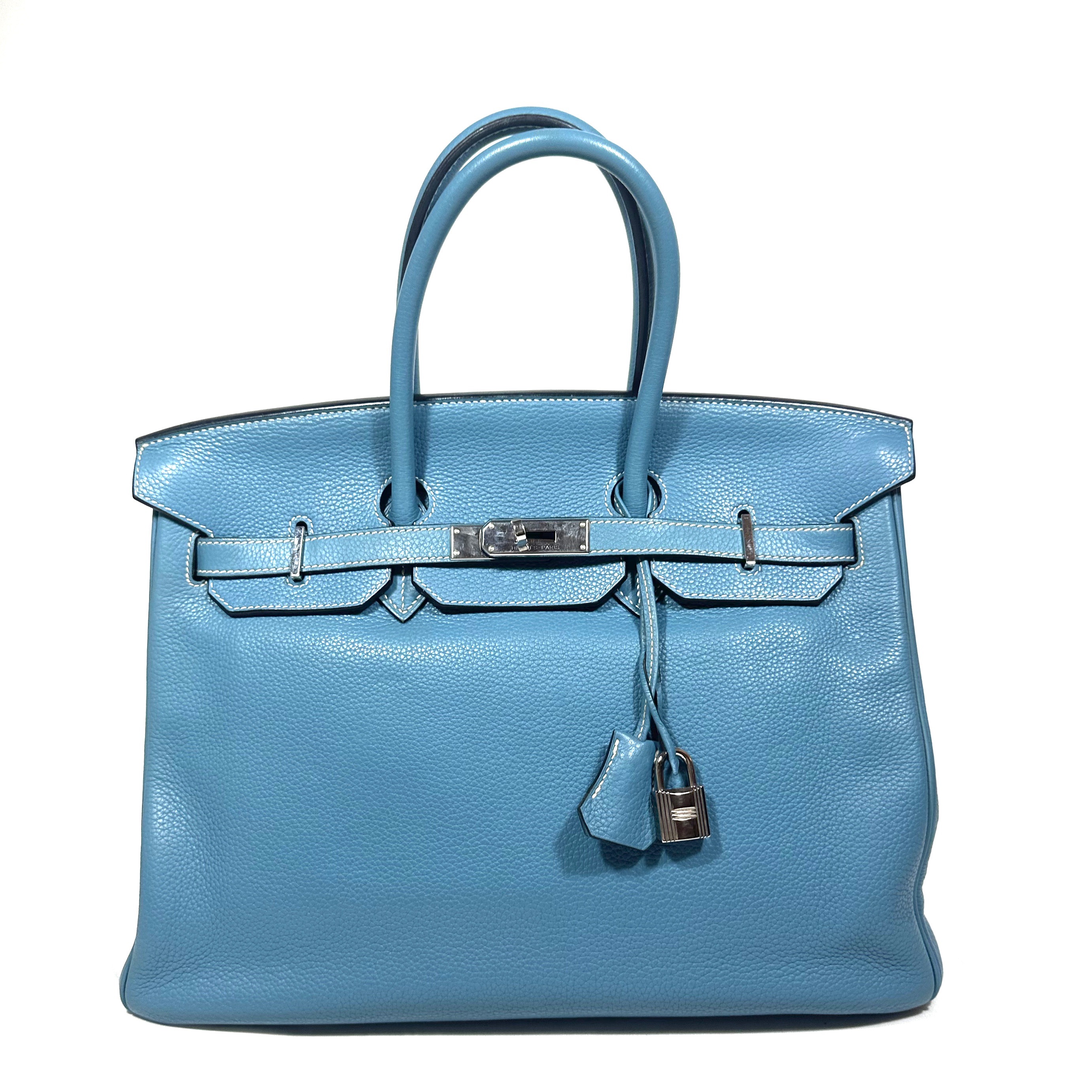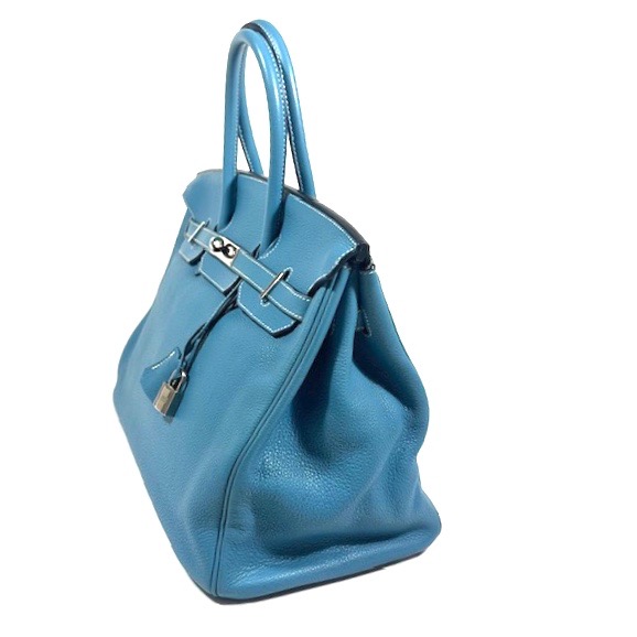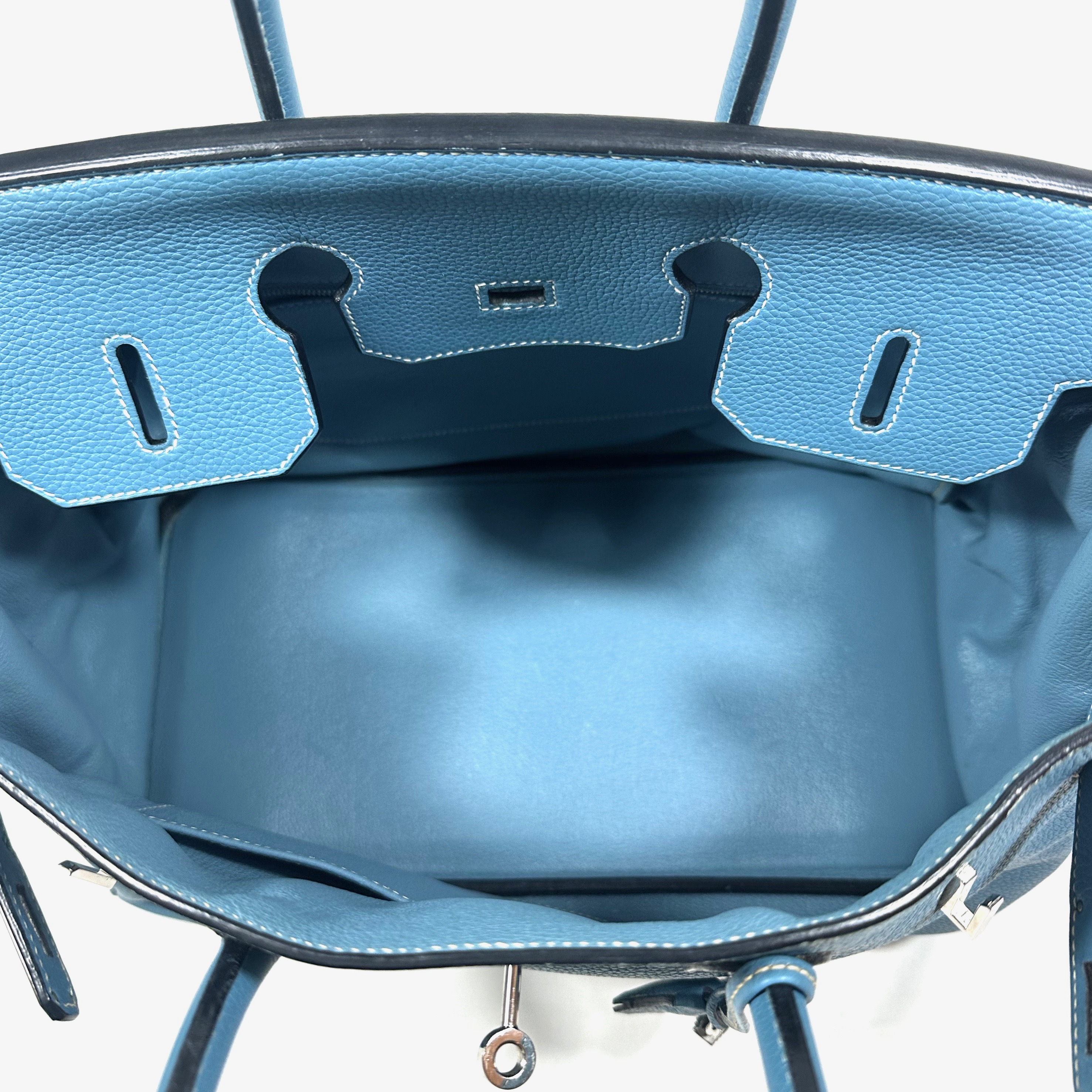 Hermès Birkin 35 Handväska. Bleu Jean togo läder med kontrasterande vita sömmar. Palladium/silvertonad hårdvara, väskan stängs med remmar och , vridlås framtill. Hänglås och en nyckel i clochette medföljer, båda numrerade 117. Metallfötter undertill. Rullade läderhandtag. Datastämpel M i kvadrat, väskan är producerad 2009.