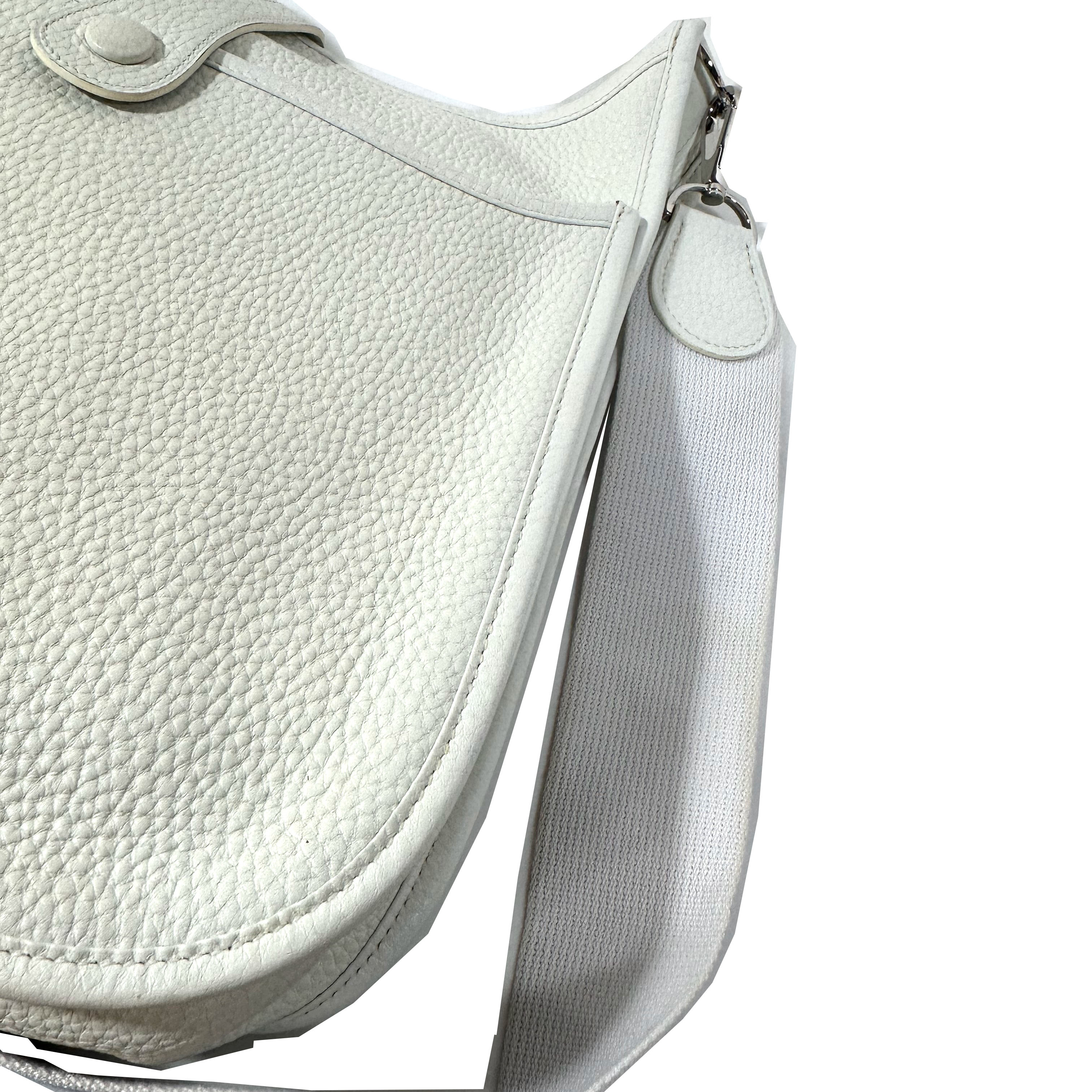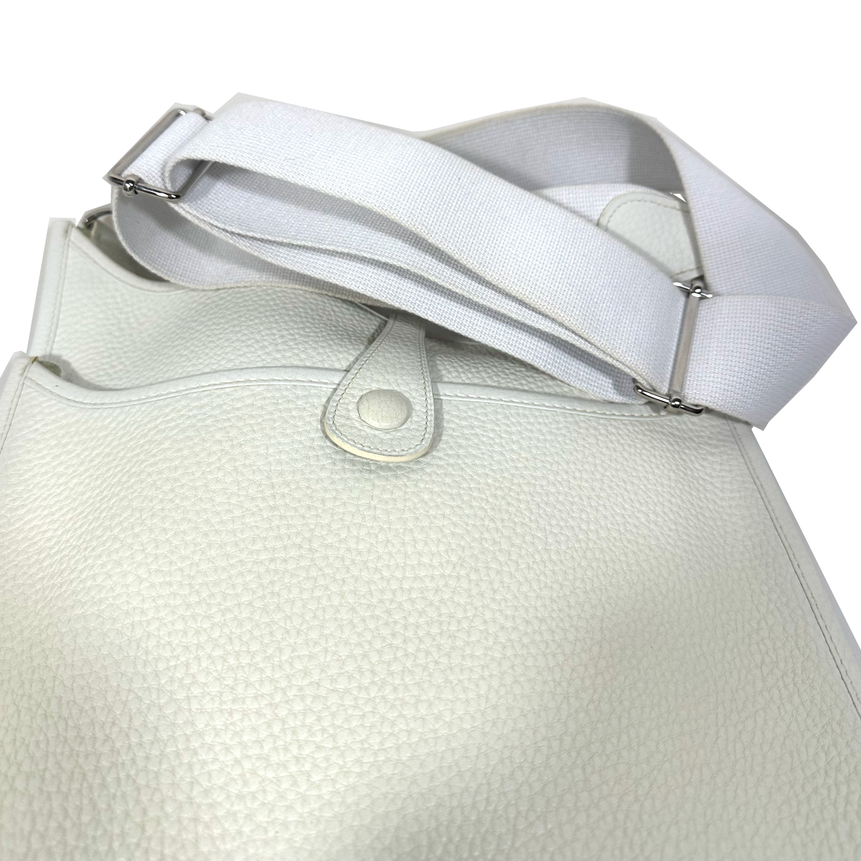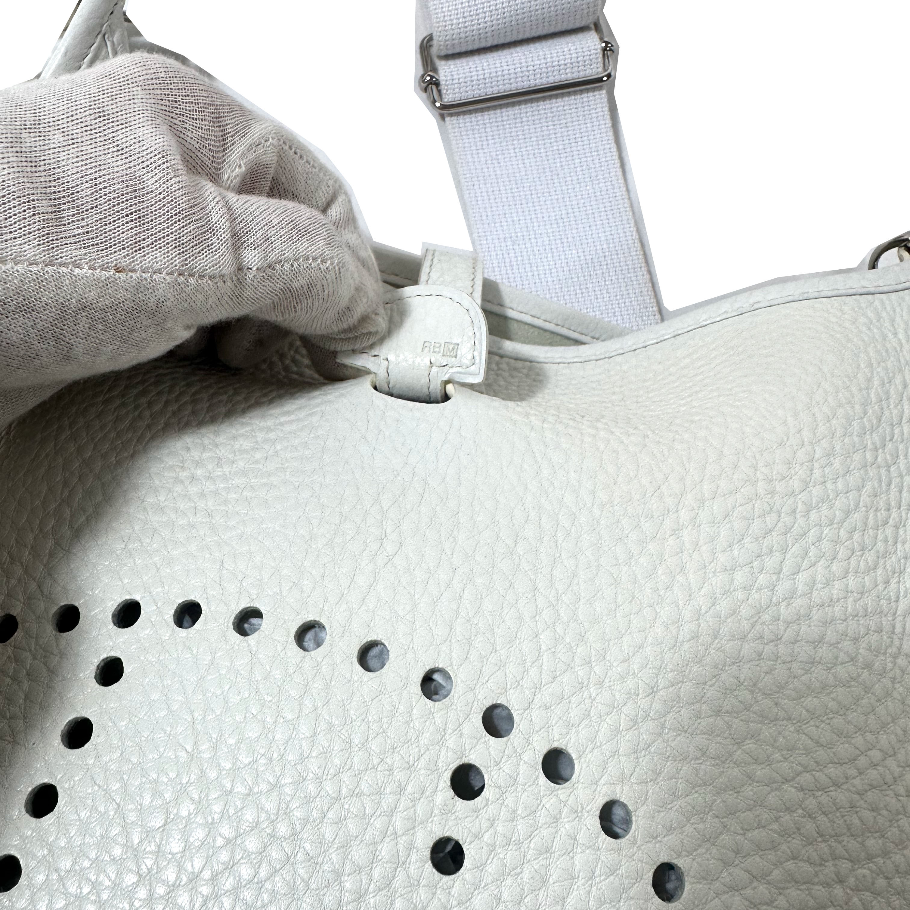 Hermès Evelyne väska i mycket bra skick. Sömmarna är lätt missfärgade (gulaktiga) på vissa ställen och den ribbade remmen är lätt missfärgad vid kanterna. Väskan och remmen ser grå ut på vissa bilder, det beror på skuggor – de är vita.