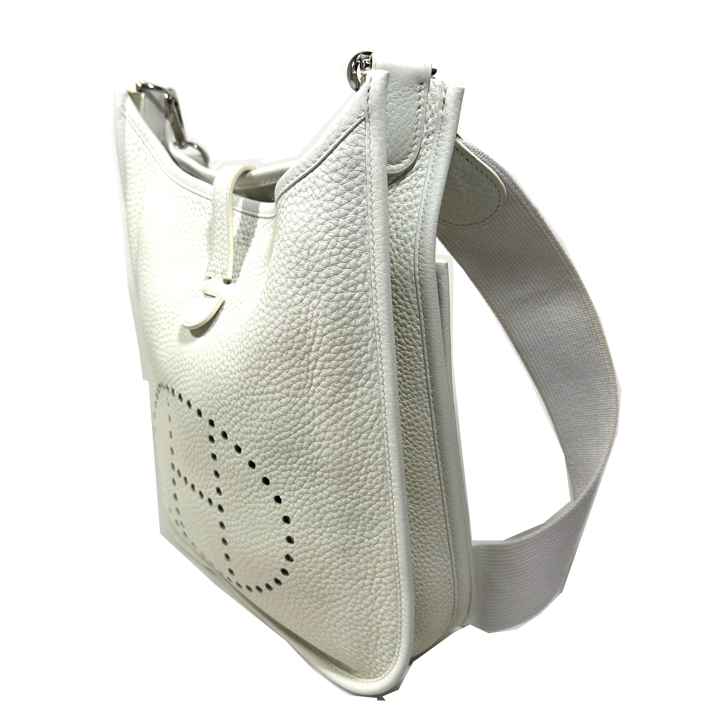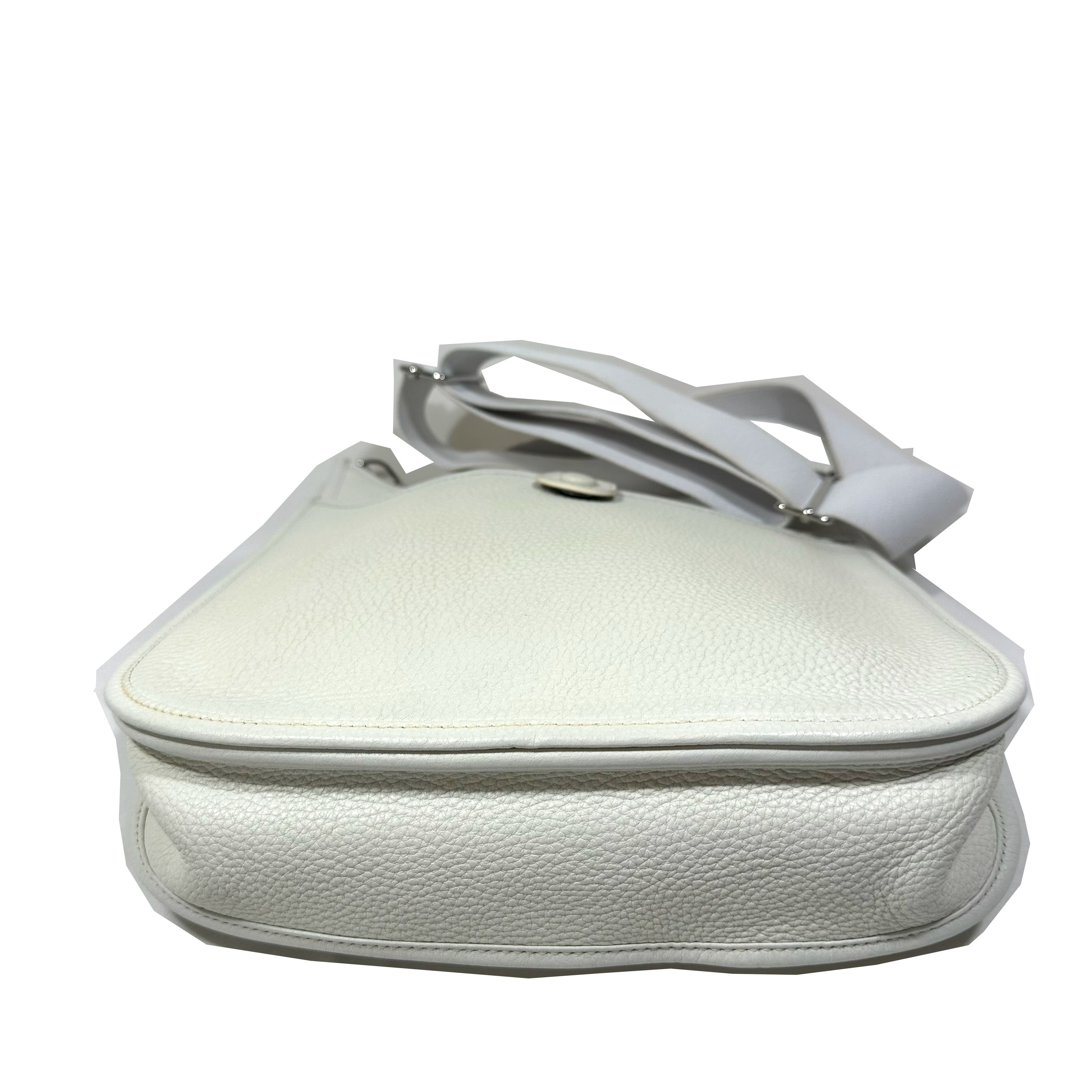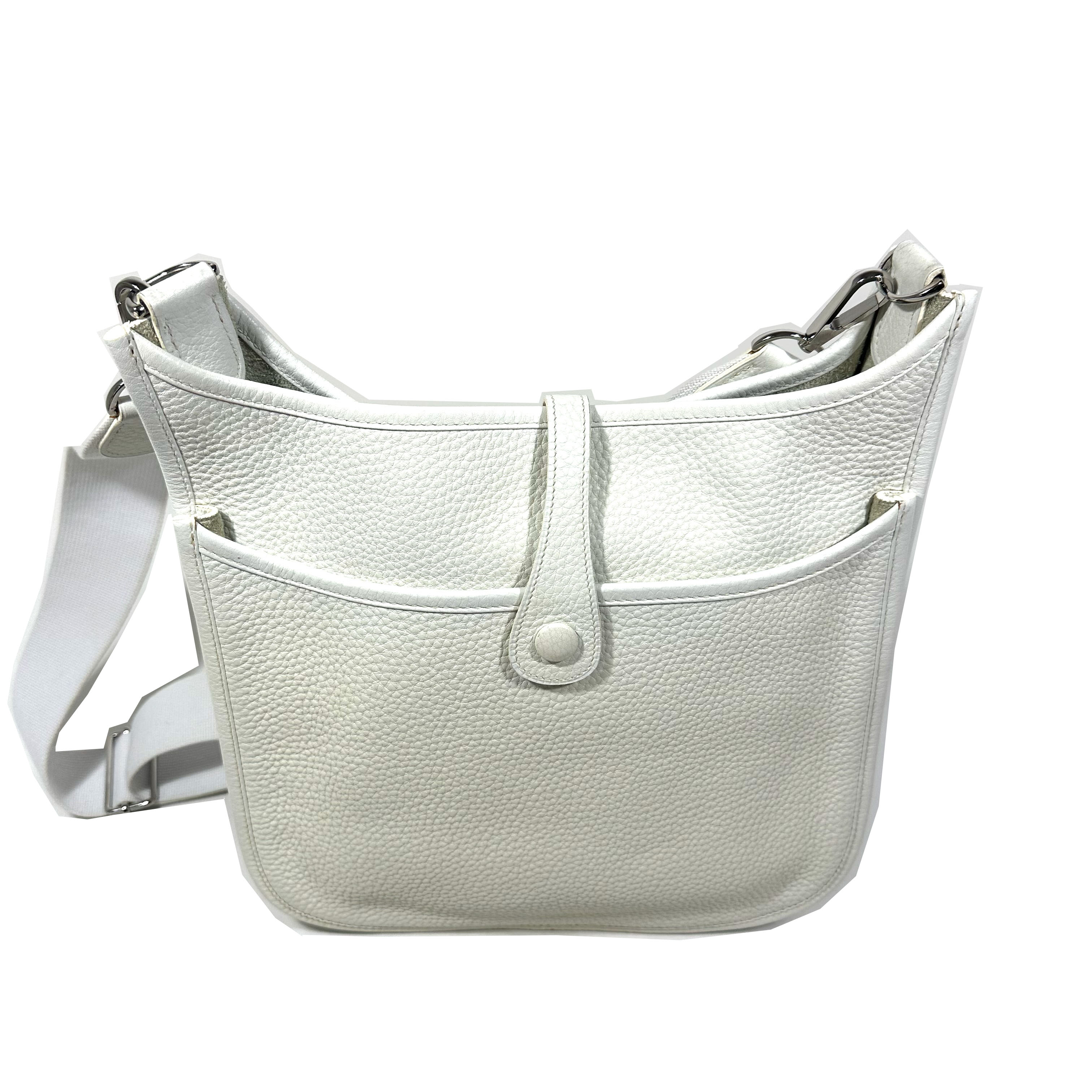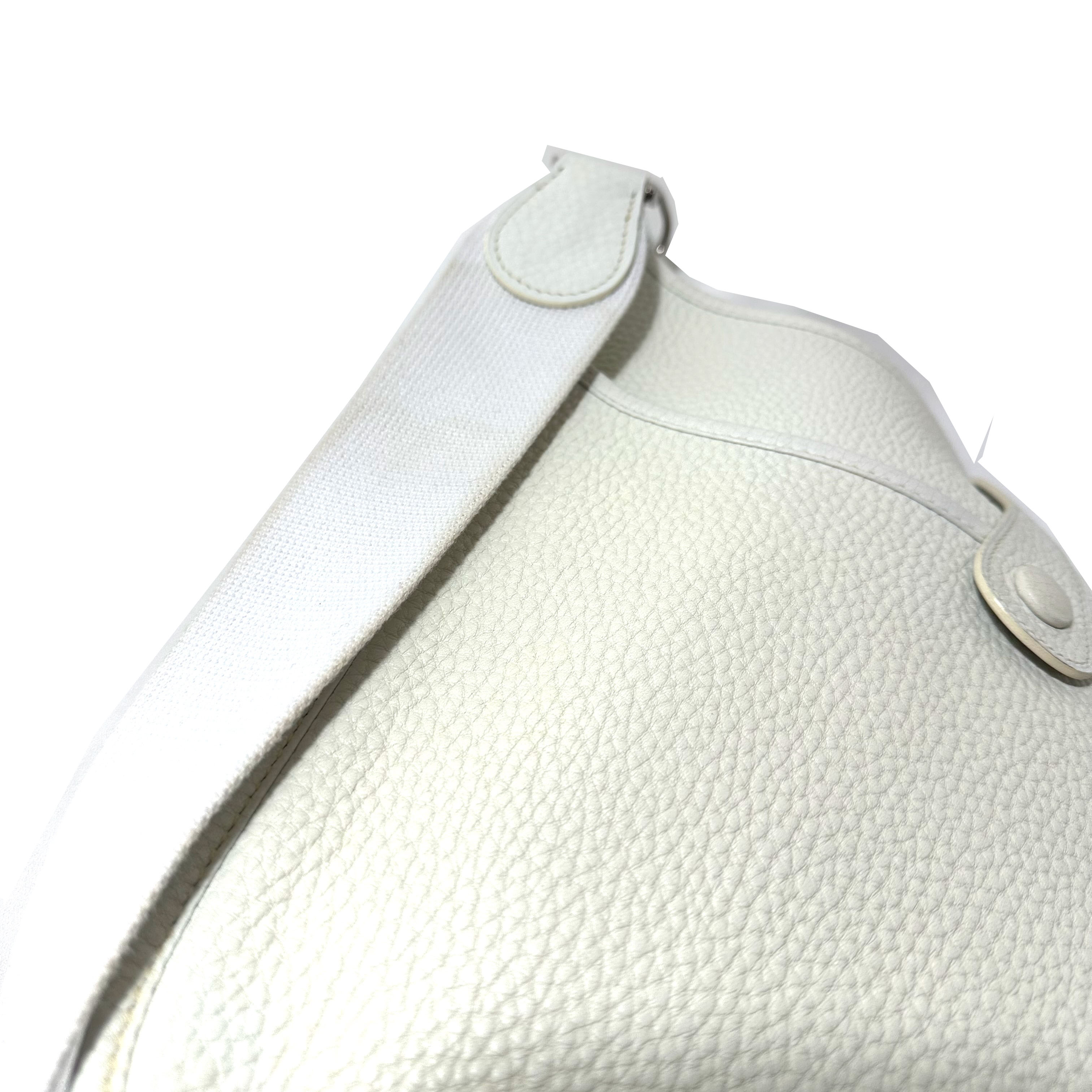 Hermès Evelyne 29 (PM) Crossboy Väska. Vitt Clemence läder, palladium (silver) tonad hårdvara, avtagbar och justerbar axelrem i ribbad textil. Stängs upptil med liten flap och tryckknapp. Stor ficka framtill med tryckknapp. Sydda kantdetaljer runt om. Insidan har perforerad ”H” logomed 63 hål: 40 för cirkeln, 9 för varje ben i ”H” och 5 i mitten av bokstaven. Serienummer M i fyrkant, väskan tillverkad 2009.
