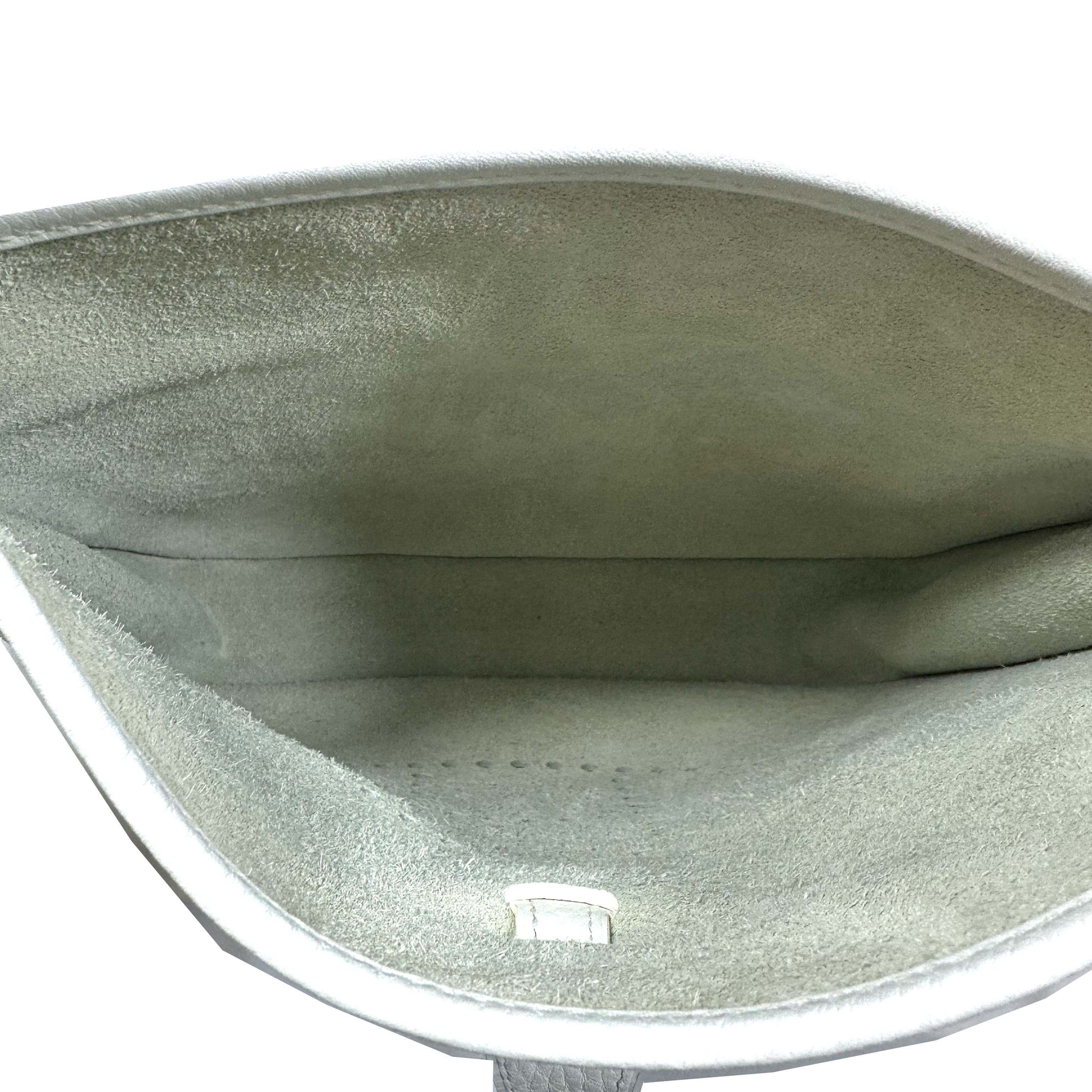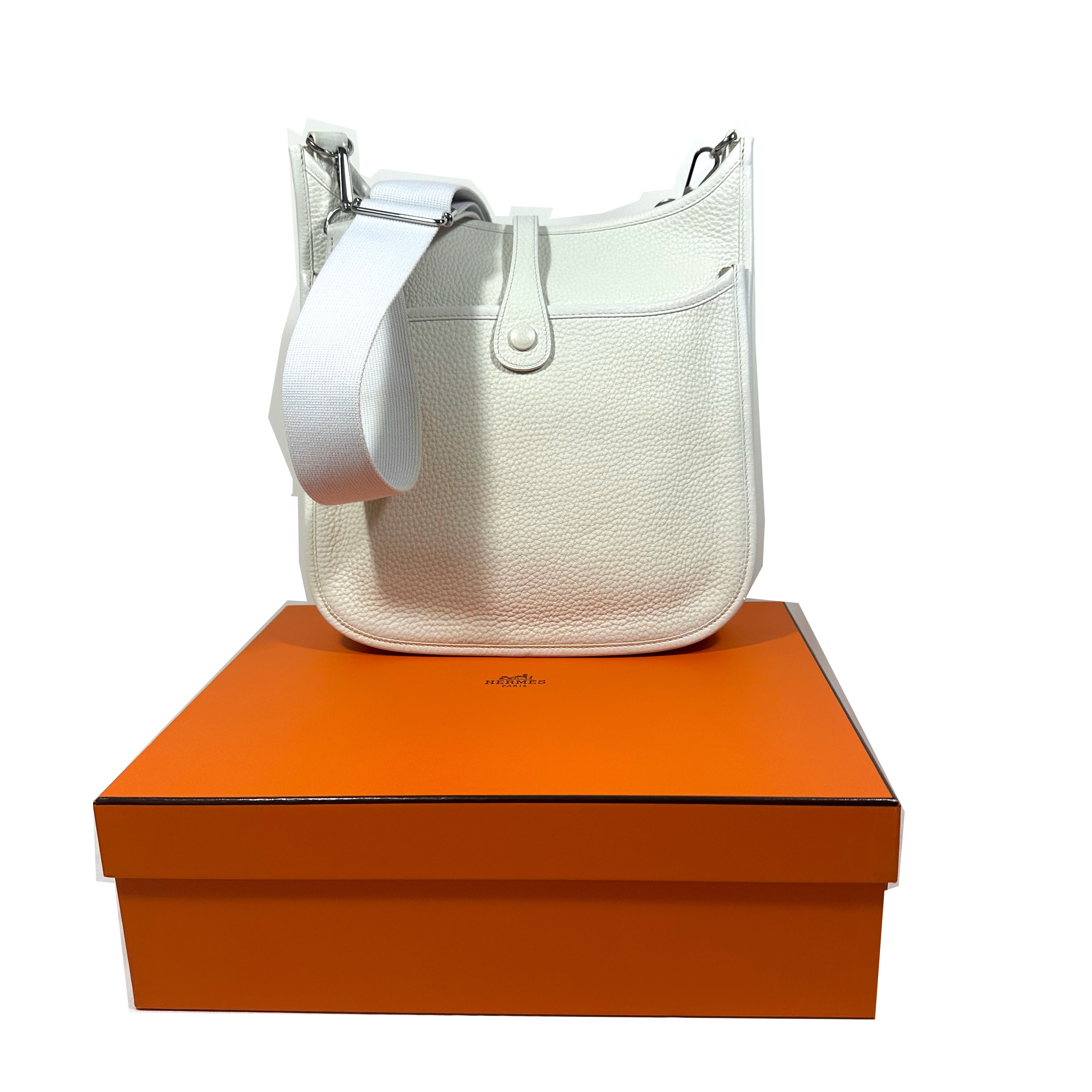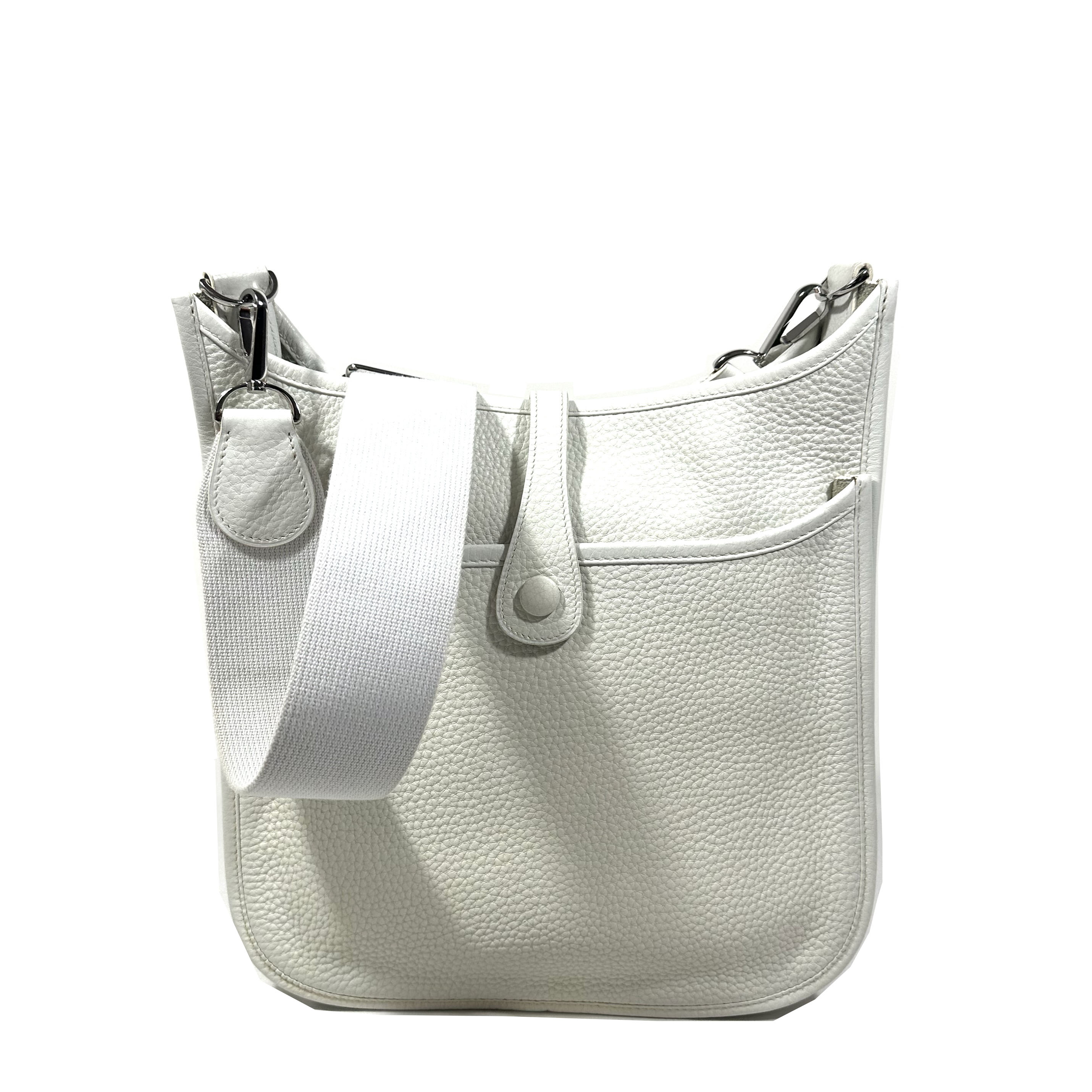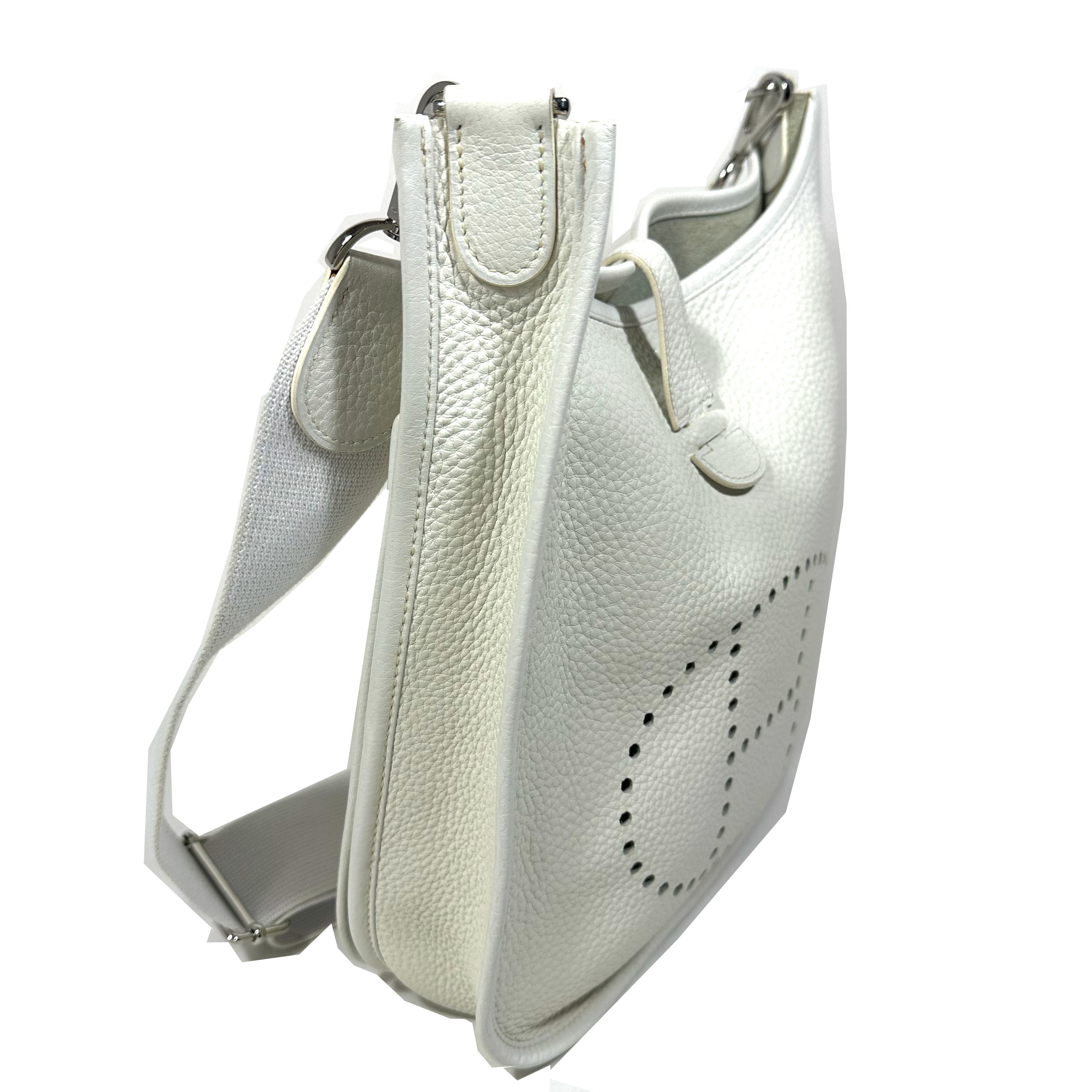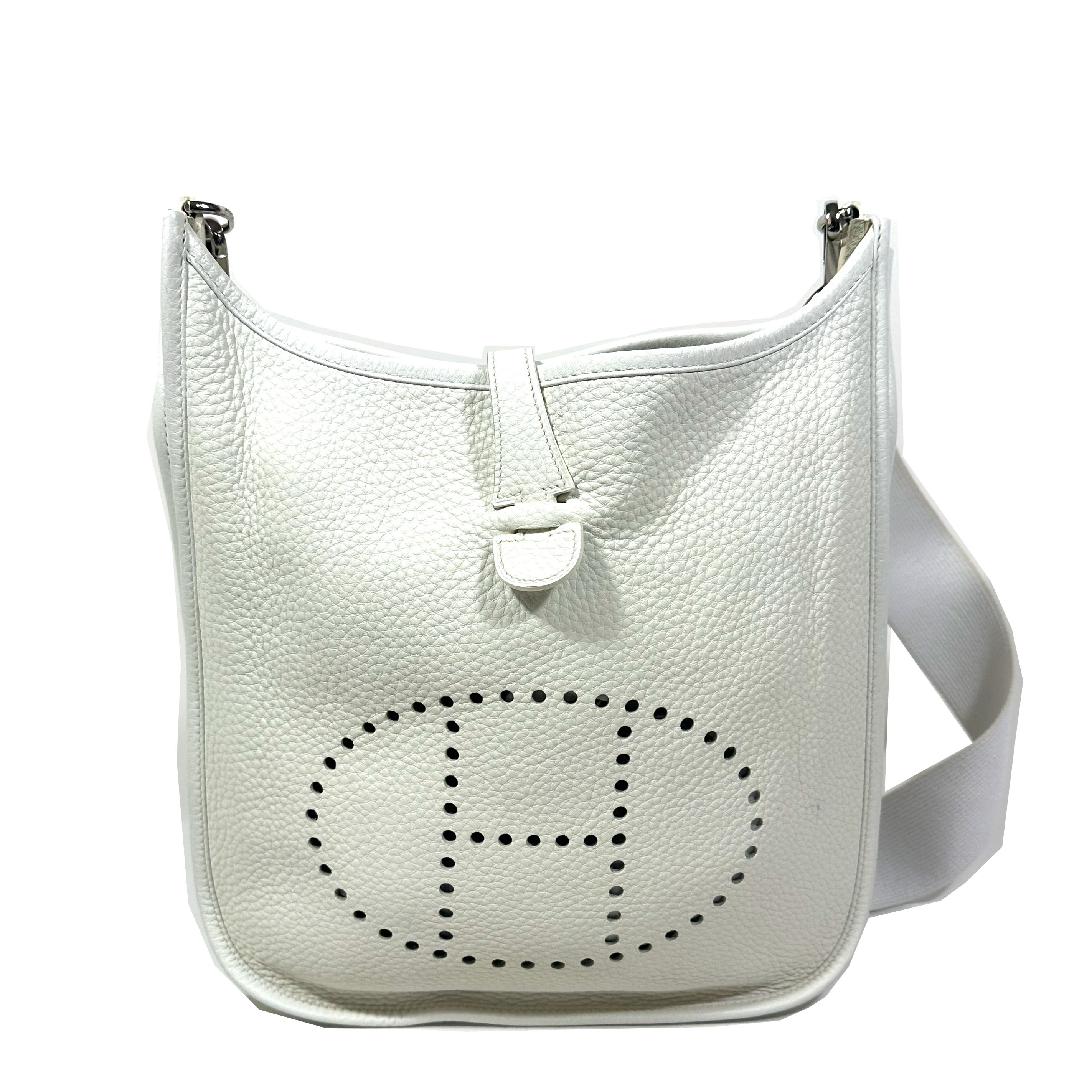 Hermès Evelyne 29 (PM) Crossboy Väska. Vitt Clemence läder, palladium (silver) tonad hårdvara, avtagbar och justerbar axelrem i ribbad textil. Stängs upptil med liten flap och tryckknapp. Stor ficka framtill med tryckknapp. Sydda kantdetaljer runt om. Insidan har perforerad ”H” logomed 63 hål: 40 för cirkeln, 9 för varje ben i ”H” och 5 i mitten av bokstaven. Serienummer M i fyrkant, väskan tillverkad 2009.