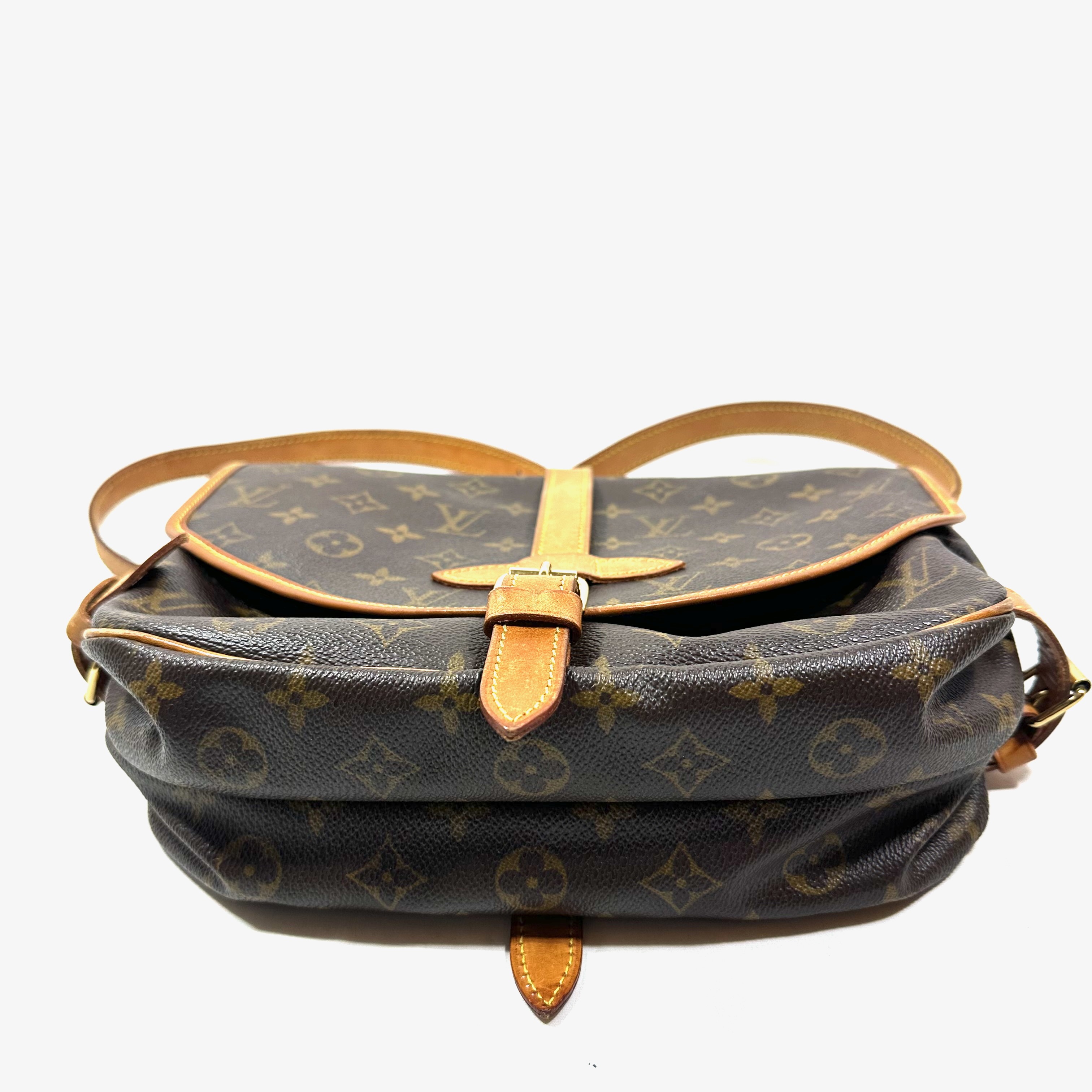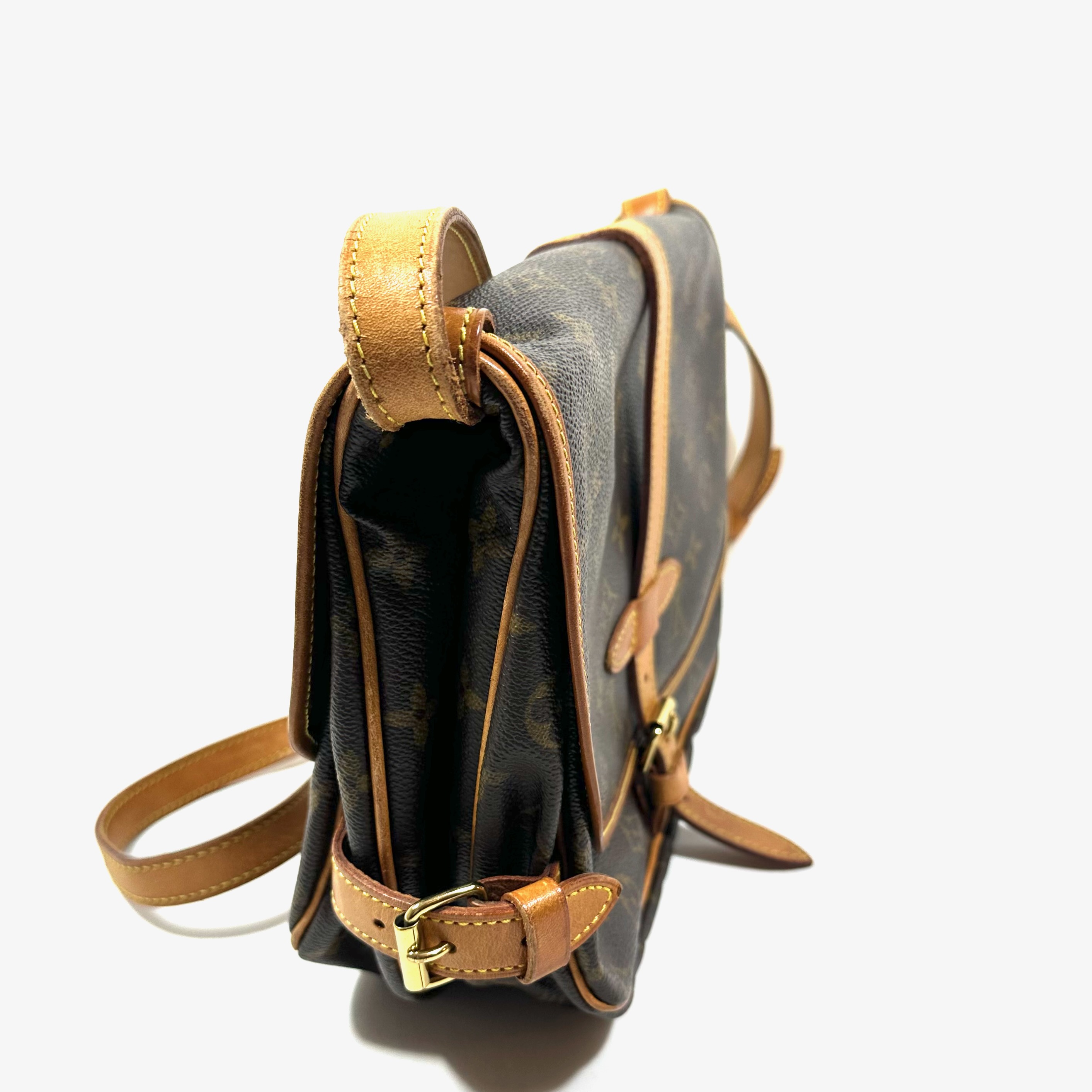 Louis Vuitton Saumur MM axelväska. Monogram canvas, guldtonad hårdvara, detaljer och justerbar axelrem i vachetta läder. Sadelformad väska som stängs med läderrem och metallspänne på båda sidor, plus på sidorna.