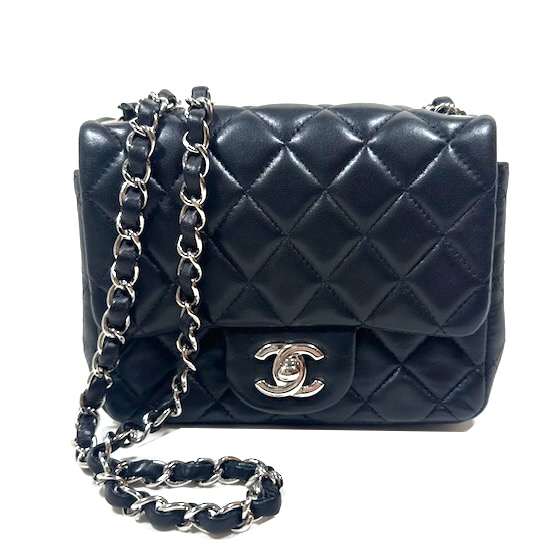 Chanel Mini Square Timeless Classic Flap Bag. Svart quiltat nappaläder med silvert onad hårdvara. Stängs framtill med vridlås under CC-logo. Axelrkedja flätad med svart läder, kan bäras på axeln eller crossbody. Öppen ficka på baksidan. Serienummer 17555929, väskan är tillverkad 2012–2013.