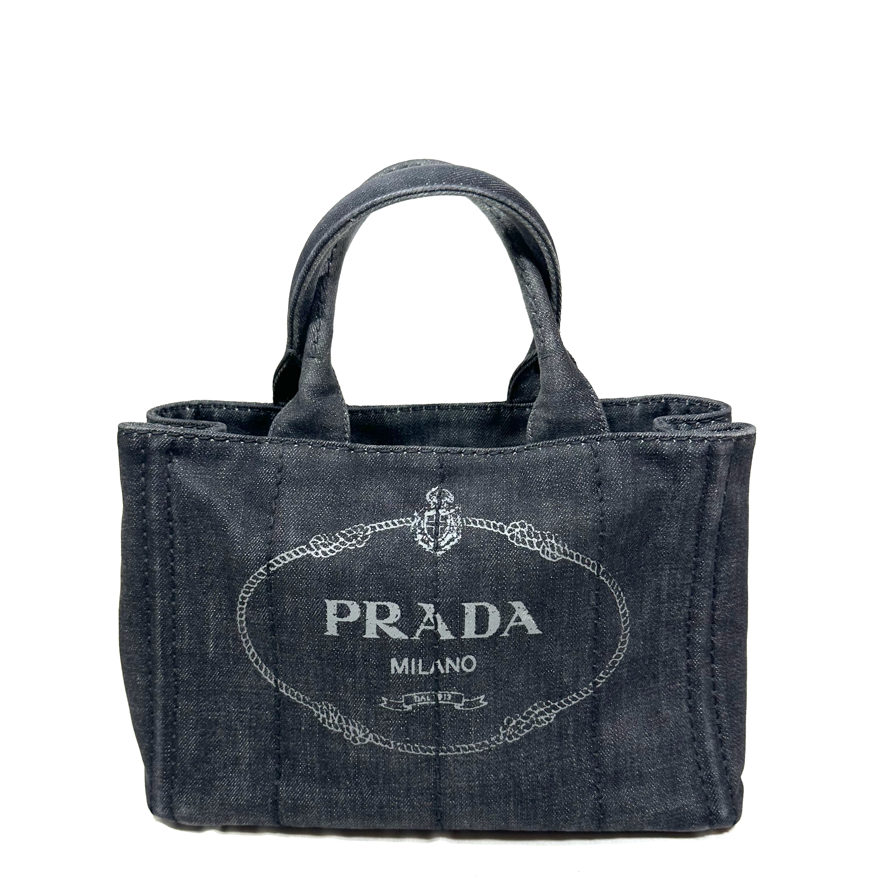 Prada Small Canapa Logo Satchel. Svart denim med Prada logo på framsidan, guldfärgad hårdvara. Två handtag upptill, justerbar och avtagbar textil axelrem, tryckknappar på sidorna för att justera bredden samt metallfötter undertill.